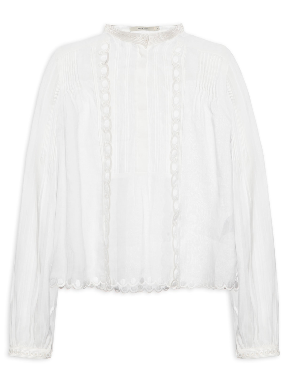 A bata branca é confeccionada em rami sem elasticidade. A peça solta ao corpo possui gola padre, mangas longas com abotoamento, detalhes bordados nas partes frontal, posterior, punhos e barra, recorte posterior, detalhes com efeito drapeado nas partes frontal, posterior e mangas, fendas laterais, leve transparência e fechamento frontal por botões.