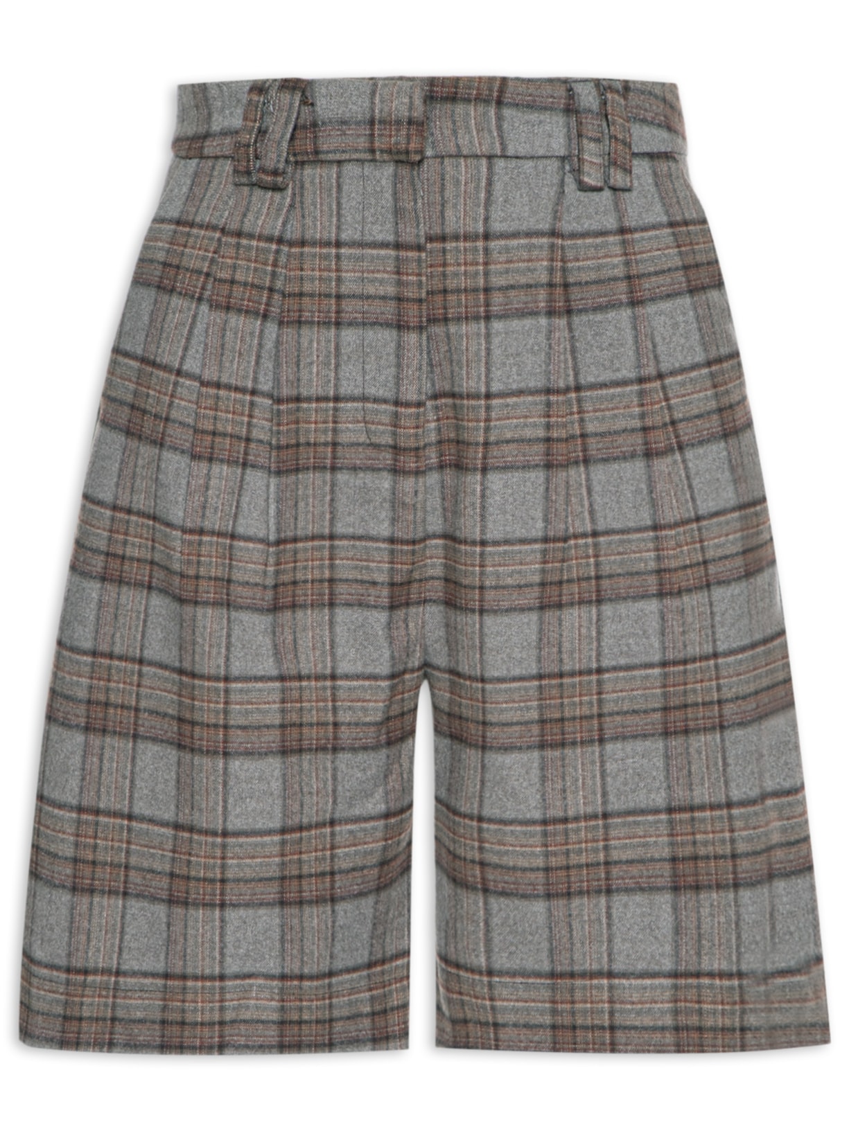 A bermuda cinza é confeccionada em tecido leve sem elasticidade. A peça solta ao corpo possui cintura alta, cós com passantes aplicados, bolsos frontais de modelo faca, pregas frontais, bolsos posteriores decorativos, padronagem xadrez em cores contrastantes, comprimento curto e fechamento frontal em zíper e colchete.