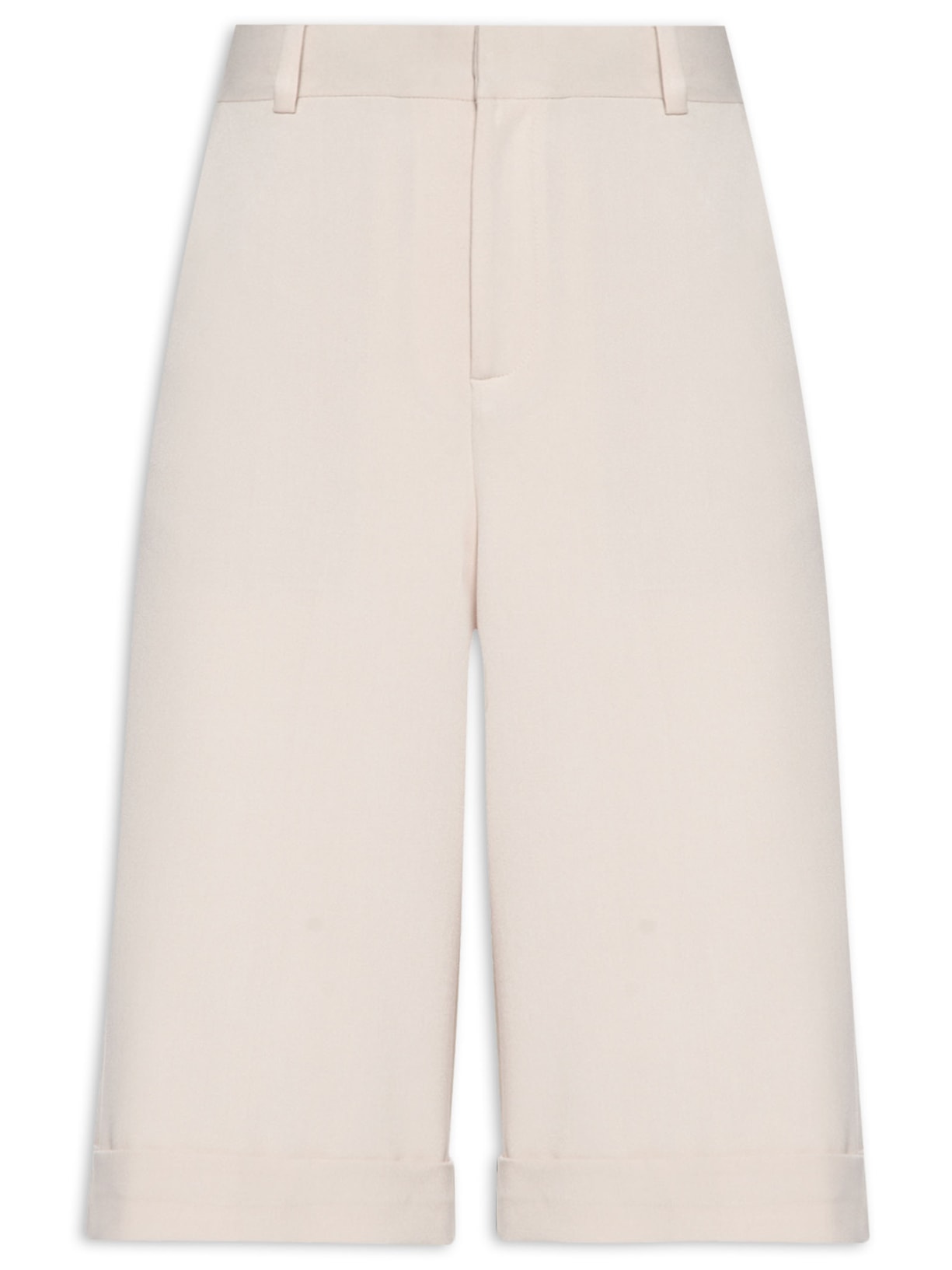 A bermuda bege é confeccionada em tecido leve sem elasticidade. A peça solta ao corpo possui cintura alta, cós com passantes aplicados, bolsos frontais de modelo faca, pences posteriores, bolsos posteriores com fechamento em botão, barra italiana, comprimento alongado e fechamento frontal em zíper e colchetes.
