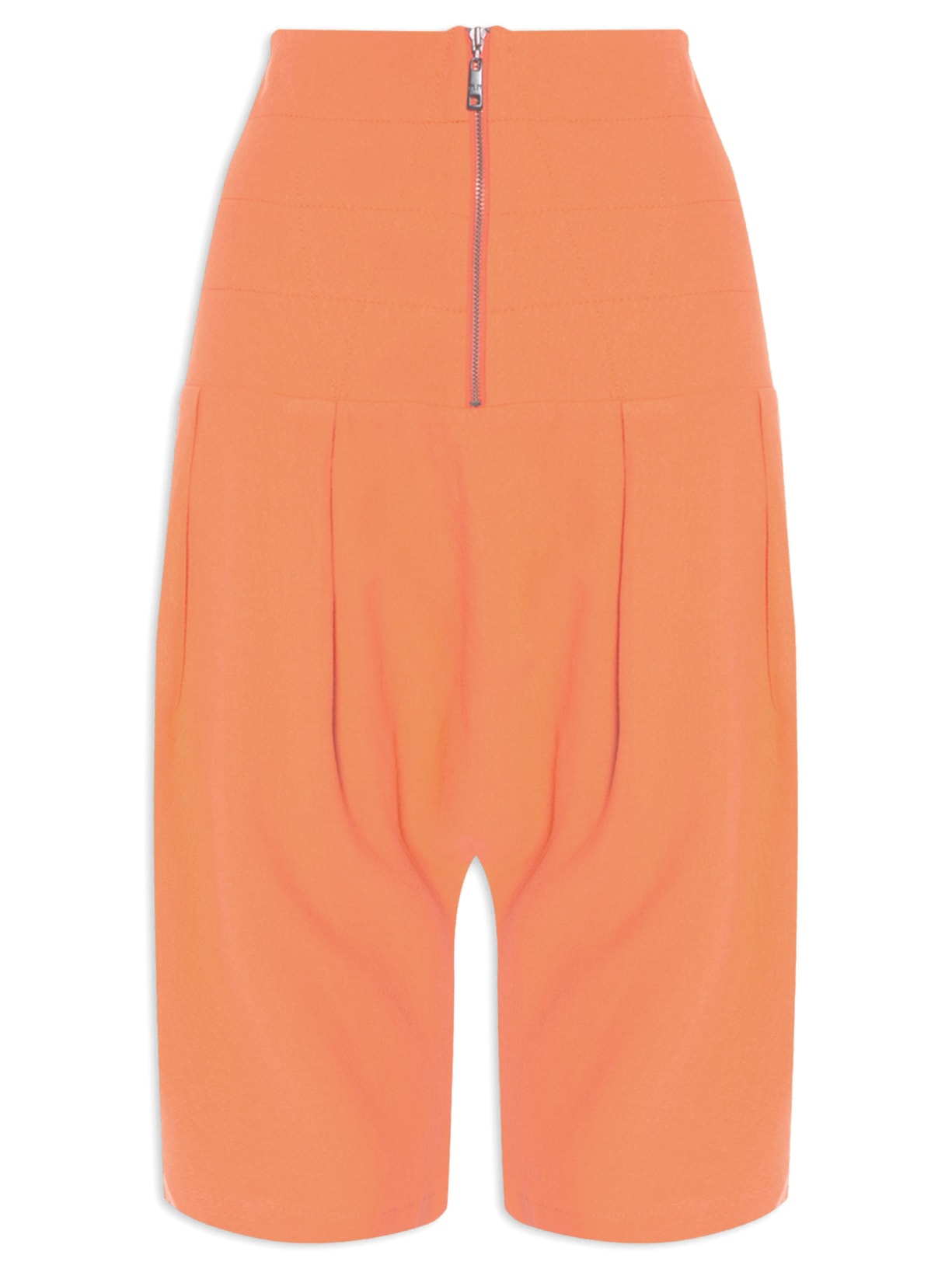 A bermuda laranja é confeccionada em linho misto. A peça de modelo saruel* possui cintura alta, cós largo com recortes, pregas frontais e posteriores, shape solto, caimento reto, acabamento pespontado e fechamento frontal por zíper metalizado.