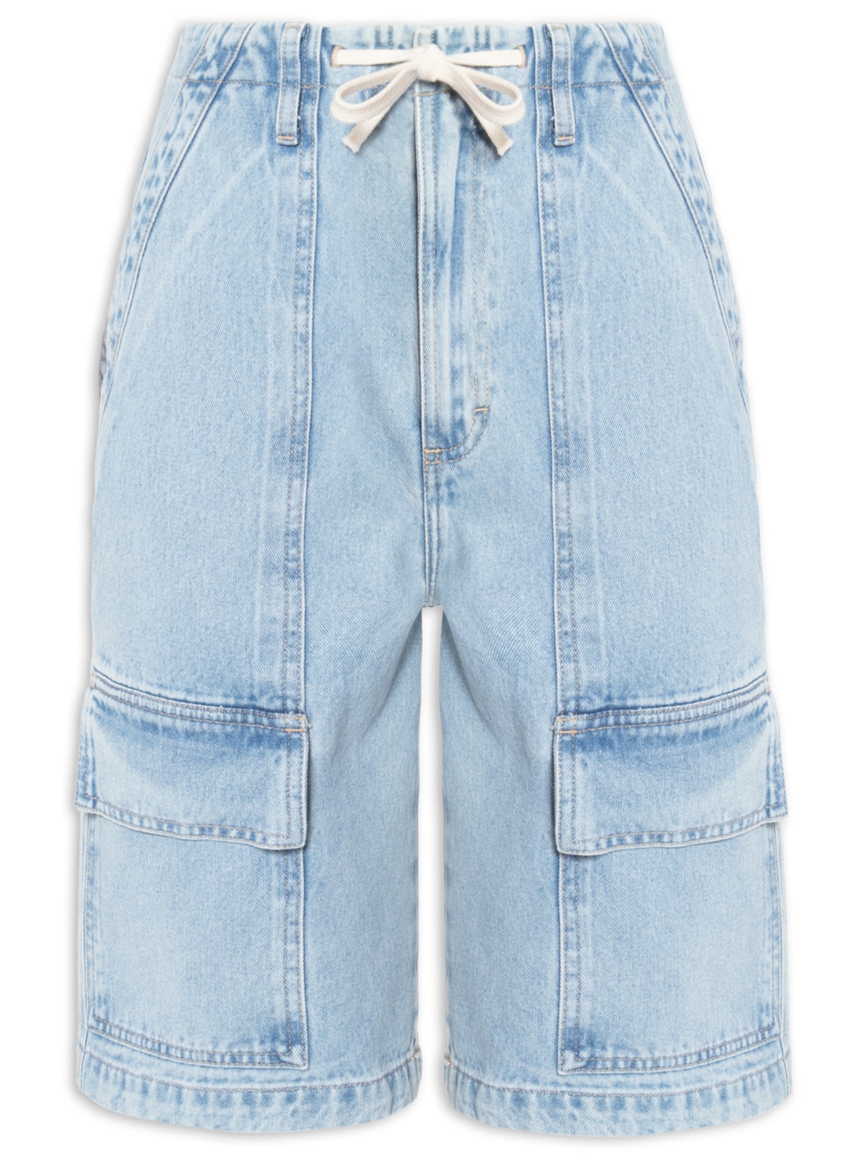 A bermuda azul é confeccionada em sarja com lavagem jeans sem elasticidade. A peça solta ao corpo possui cintura alta, cós com cordão embutido para ajuste e passantes para cinto aplicados, dois bolsos frontais, dois bolsos posteriores com abas sobrepostas, dois bolsos na altura do joelho na parte frontal com abas sobrepostas, recortes frontais, detalhes pespontados em cor contrastante, comprimento médio, e fechamento frontal por zíper e gancho.