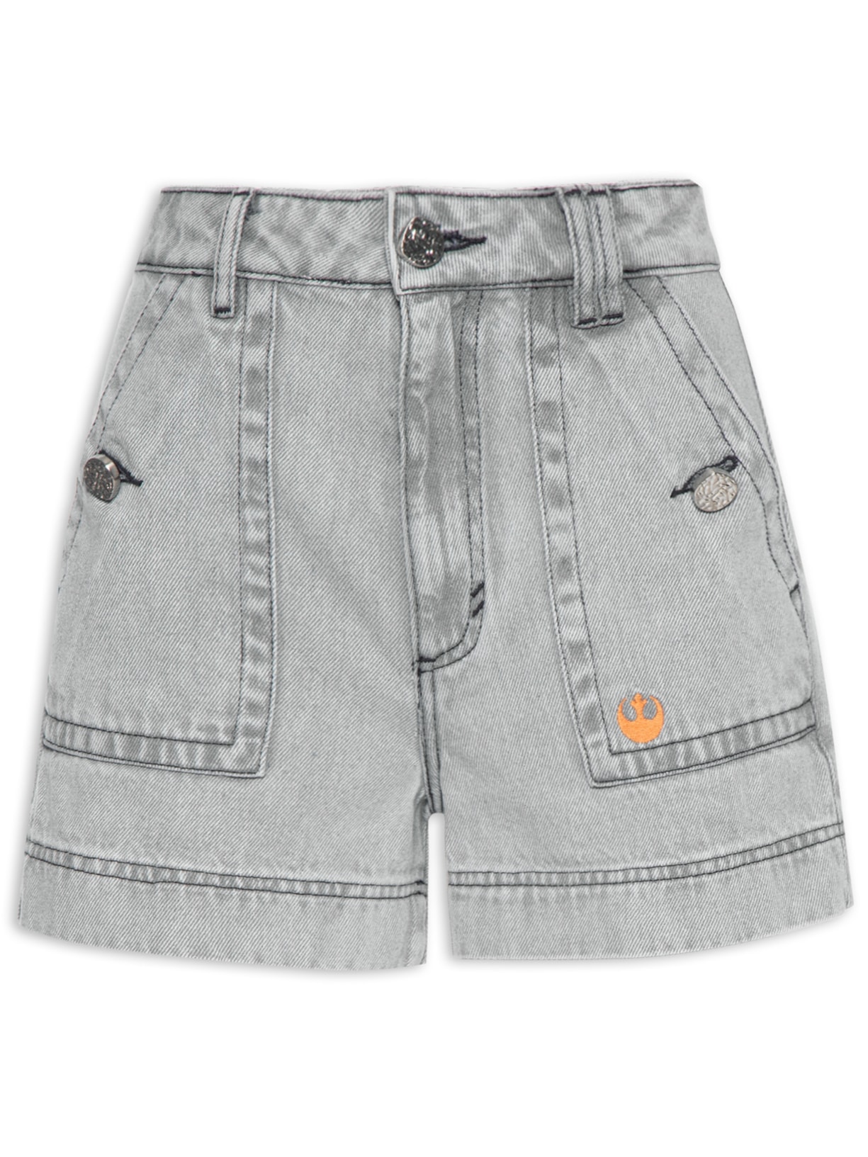 A bermuda cinza é confeccionada por sarja com lavagem em jeans com média elasticidade. A peça solta ao corpo possui cintura alta, bolsos frontais com fechamento por botões, logo da marca abordado no bolso frontal, recorte posterior, bolsos posteriores com bordado, fechamento por zíper e botão e comprimento curto.