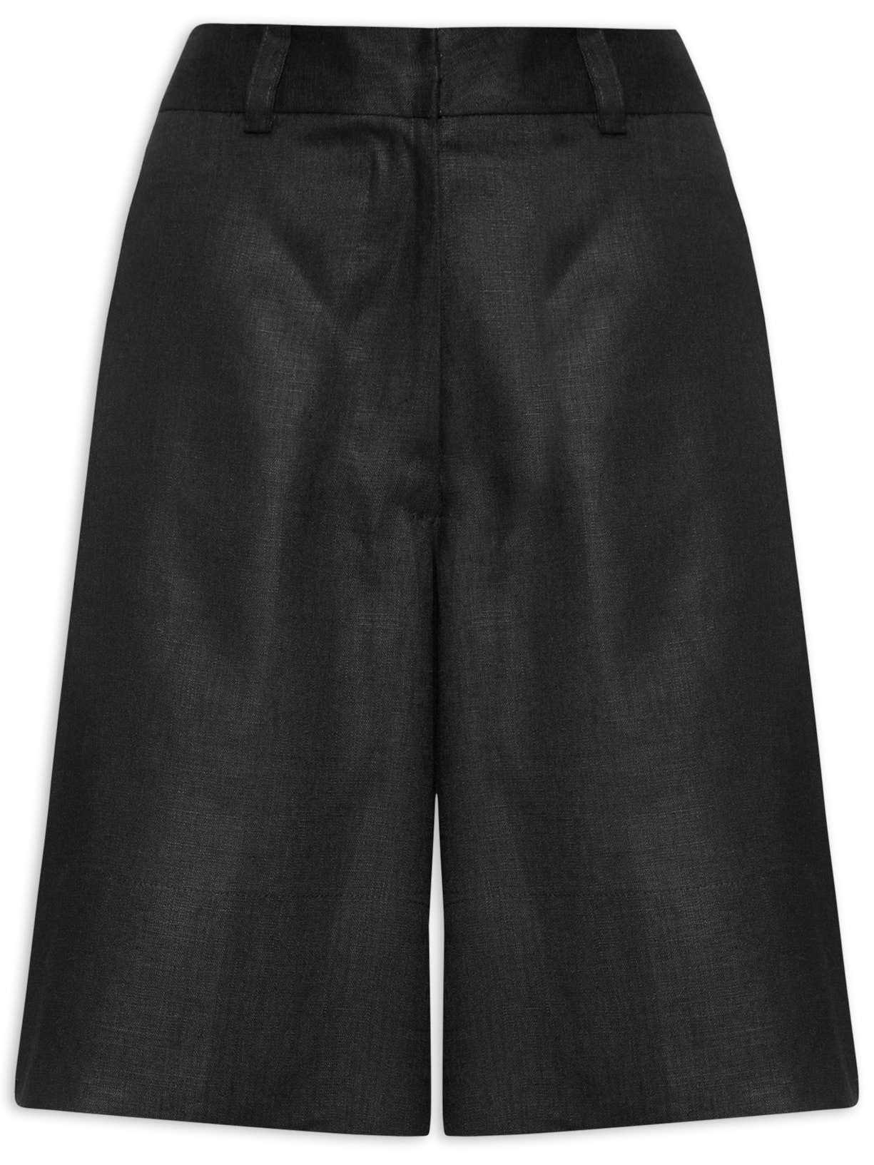 A bermuda preta é confeccionada em linho sem elasticidade. A peça solta ao corpo possui cintura alta, passantes aplicados no cós, bolsos frontais no modelo faca, bolsos posteriores, fechamento por zíper e colchete e comprimento médio.