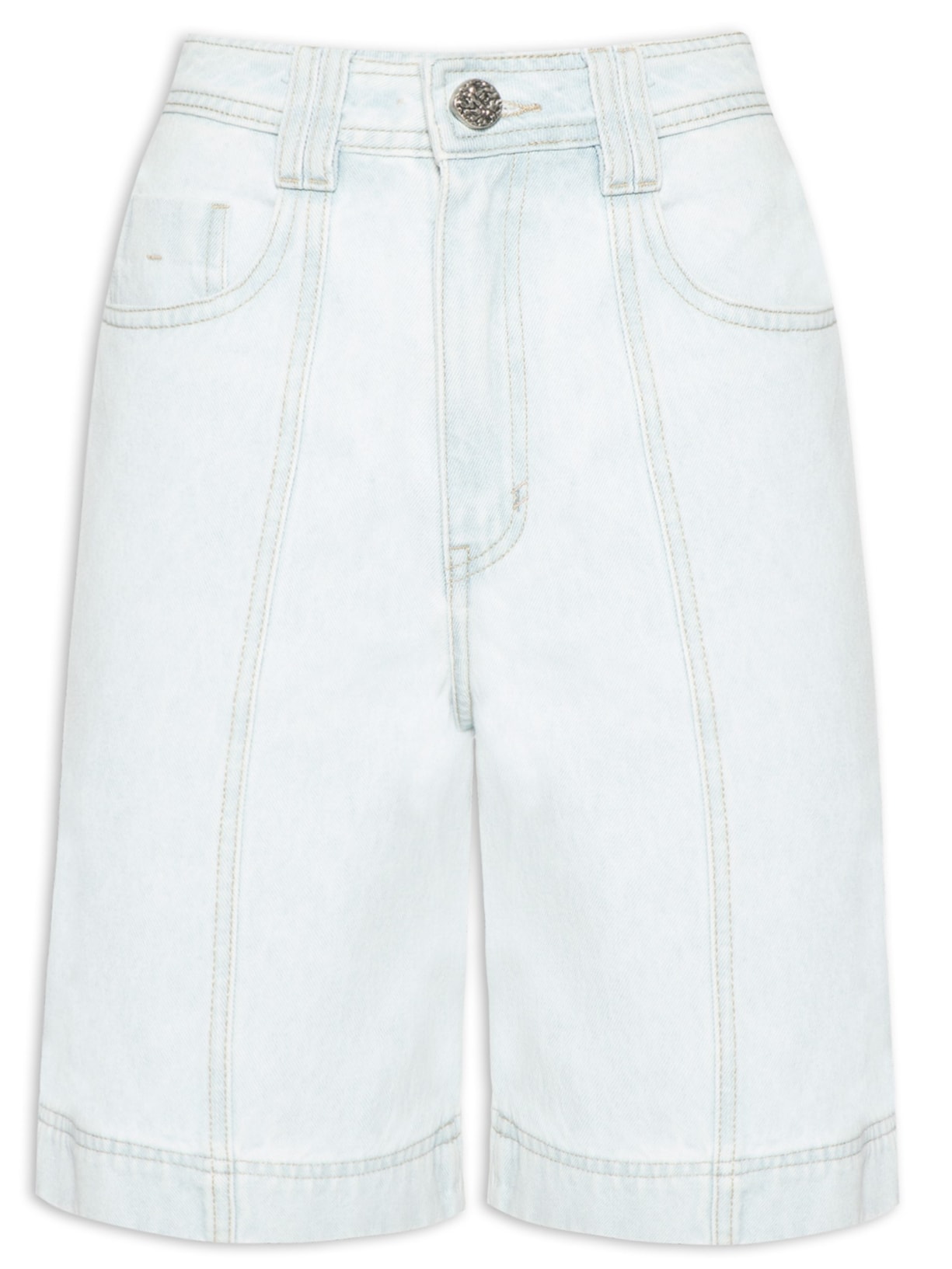 A bermuda azul é confeccionada em sarja com lavagem jeans e sem elasticidade. A peça solta ao corpo possui cintura alta, cós com passantes e tag da marca aplicada na parte posterior, bolsos frontais com rebites metalizados, bolsos posteriores com detalhe de recorte vazado e aplicação de canutilhos metalizados, recortes, barra estendida, efeito delavê, comprimento curto e fechamento frontal em zíper e botão.