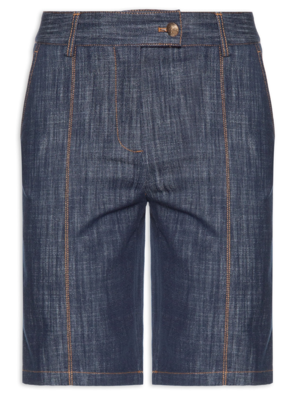 A bermuda azul marinho é confeccionada em sarja com lavagem em jeans com baixa elasticidade. A peça solta ao corpo possui cintura alta, cós com passantes, bolsos posteriores decorativos, tag da marca aplicada em metal na parte posterior, bolsos frontais modelo faca, acabamento pespontado na cor marrom e fechamento frontal por botões e zíper.