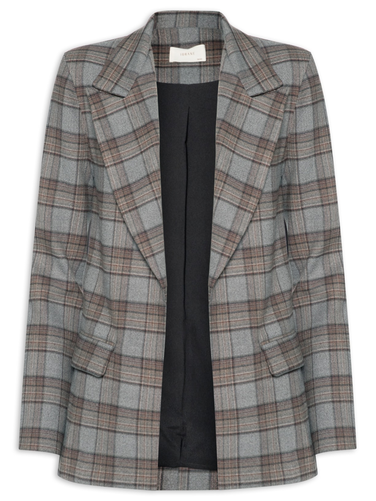 O blazer cinza é confeccionado em tecido encorpado sem elasticidade. A peça solta ao corpo possui lapela chanfrada, mangas longas, ombreira, recorte posterior, bolsos frontais embutidos com fechamento por aba, forro, padronagem xadrez em cores contrastantes e não possui fechamento.
