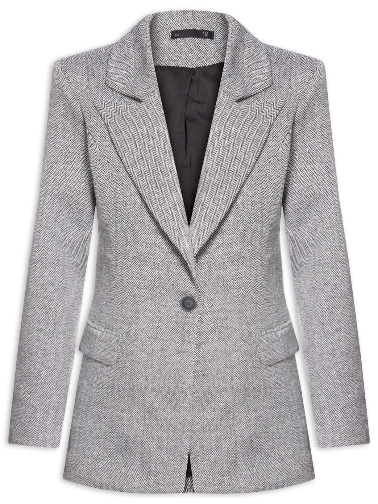 O blazer cinza é confeccionado em tecido leve sem elasticidade. A peça solta ao corpo possui lapela chanfrada, mangas longas, ombreira, recortes posteriores, bolsos frontais decorativos com vista sobreposta, mini padronagem chevron na cor branca, forro e fechamento frontal por botão.
