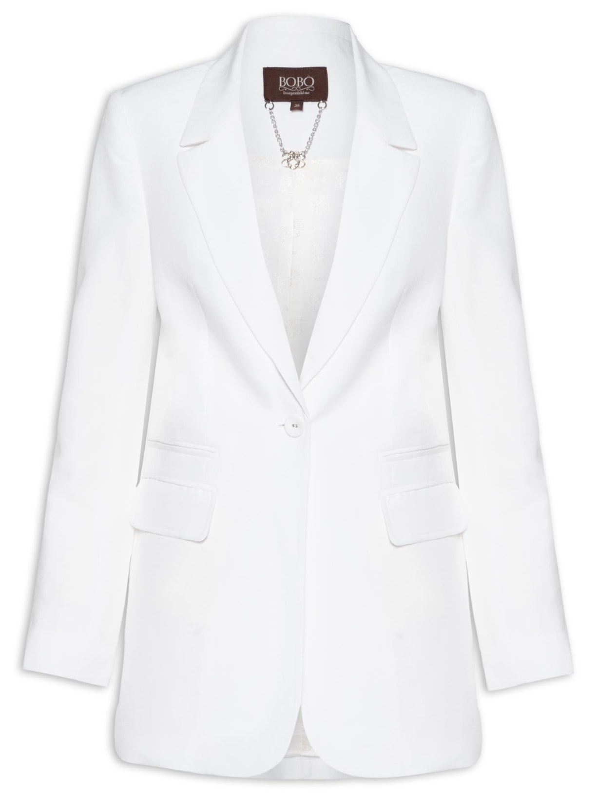 O blazer branco é confeccionado em tecido leve com toque de linho sem elasticidade. A peça solta ao corpo possui lapela chanfrada, mangas longas com abotoamento nos punhos, ombreiras embutidas, quatro bolsos frontais sendo dois deles decorativos e dois com abas sobrepostas, forro, recortes posteriores, e fechamento frontal por botão.