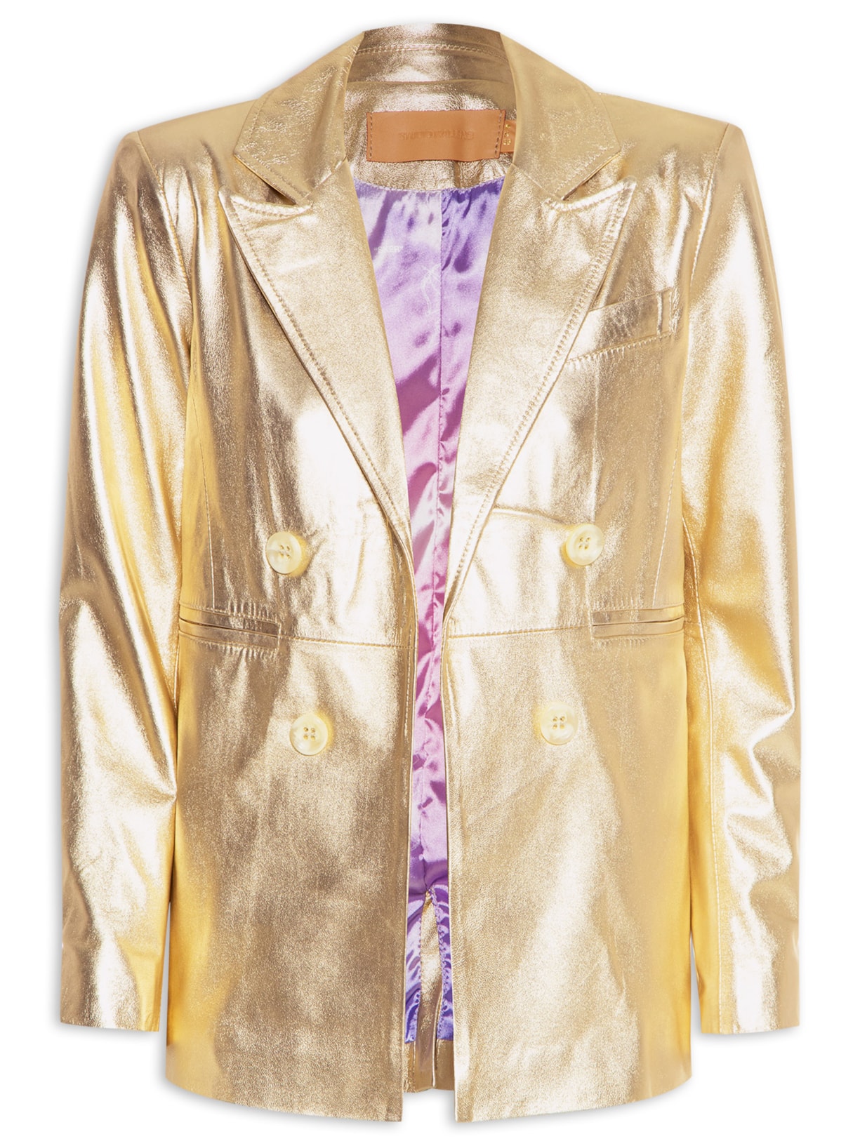 O blazer dourado é confeccionado em couro com superfície metalizada. A peça possui lapela chanfrada, ombreiras embutidas, mangas longas com abotoamento nos punhos, bolsos e botões frontais decorativos, recortes frontais e pences posteriores, fenda posterior, forro com efeito degradê e estampa figurativa, comprimento alongado e shape solto.