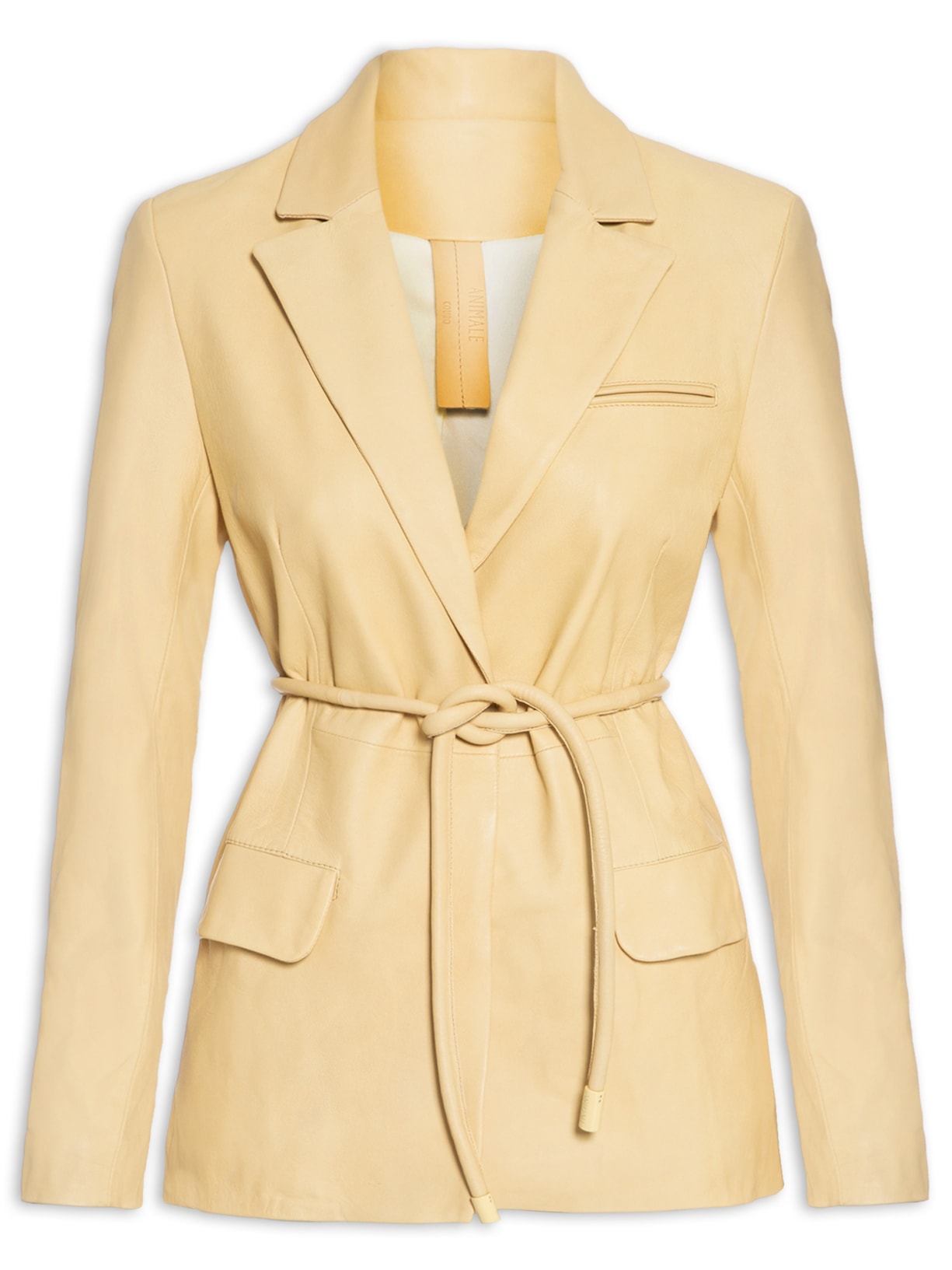 O blazer bege é confeccionado em couro. A peça possui lapela chanfrada, ombreiras embutidas, mangas longas com abotoamento nos punhos, bolso frontal decorativo na altura do busto, recortes frontais e posteriores, passante fixo aplicado na parte posterior da cintura, bolsos frontais embutidos com fechamento por abas sobrepostas, forro, fendas laterais, comprimento alongado, shape solto, caimento reto e acabamento pespontado. Acompanha cordão da mesma cor e tecido para uso opcional.