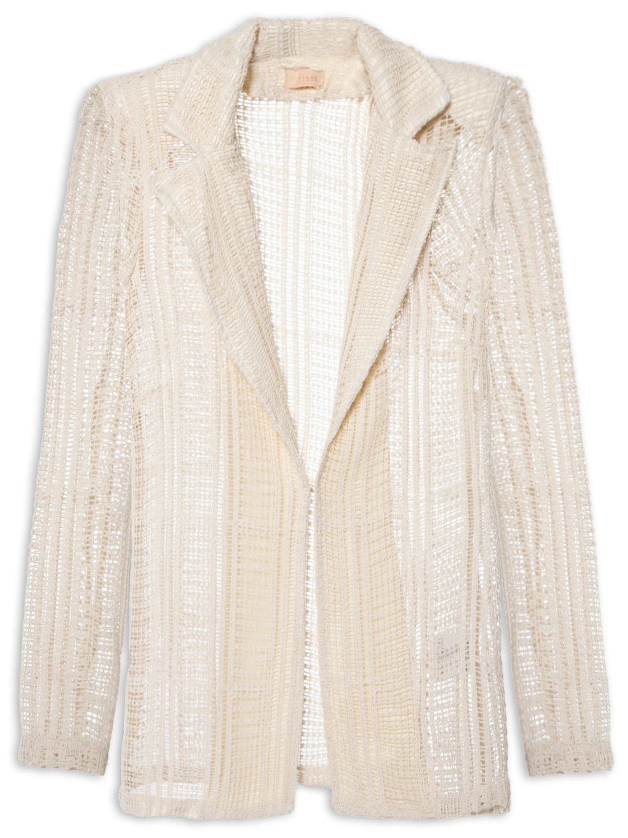 O blazer bege é confeccionado em renda em cordão tecido de garrafa pet reciclado. A peça possui lapela chanfrada, mangas longas, ombreiras, transparência, comprimento alongado e não possui fechamento.