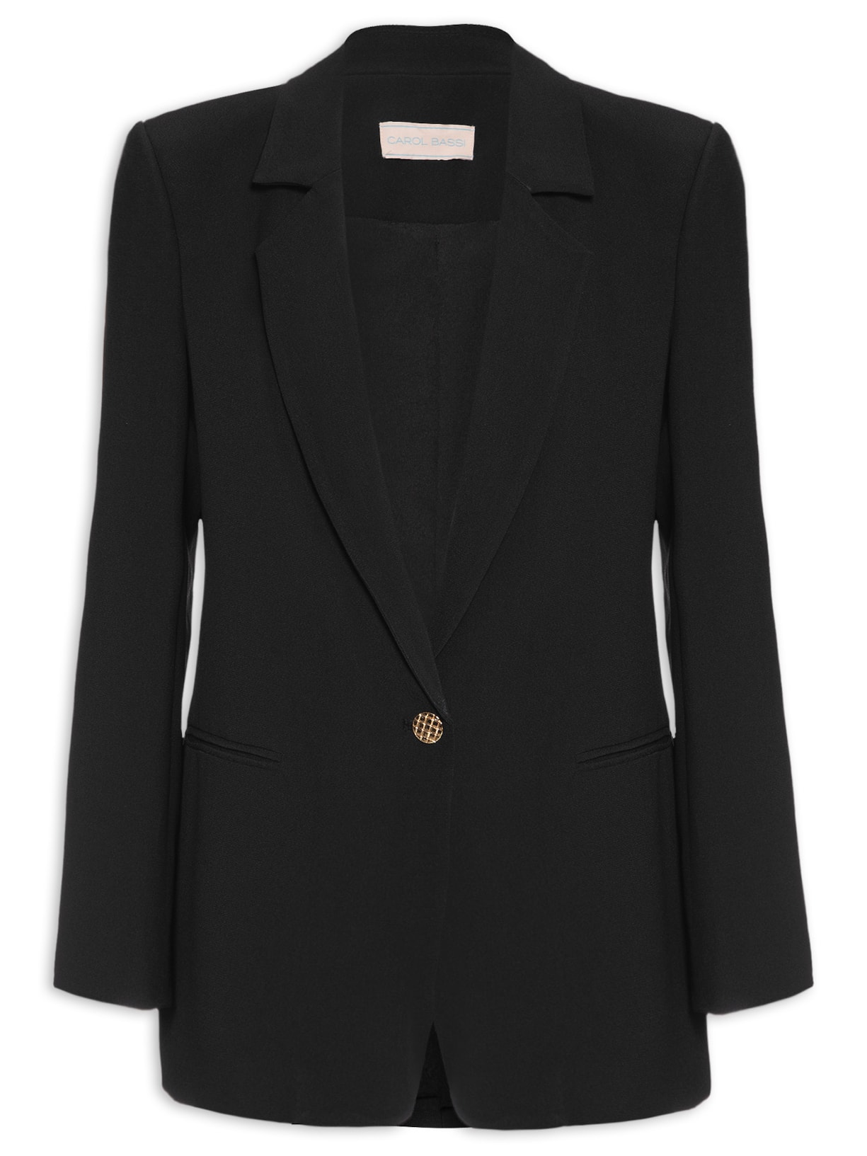 O blazer preto é confeccionado em crepe. A peça possui lapela chanfrada, ombreiras embutidas, mangas longas, bolsos frontais decorativos, recorte posterior, forro, comprimento alongado, shape solto, caimento reto, acabamento pespontado e fechamento frontal por botão metalizado.