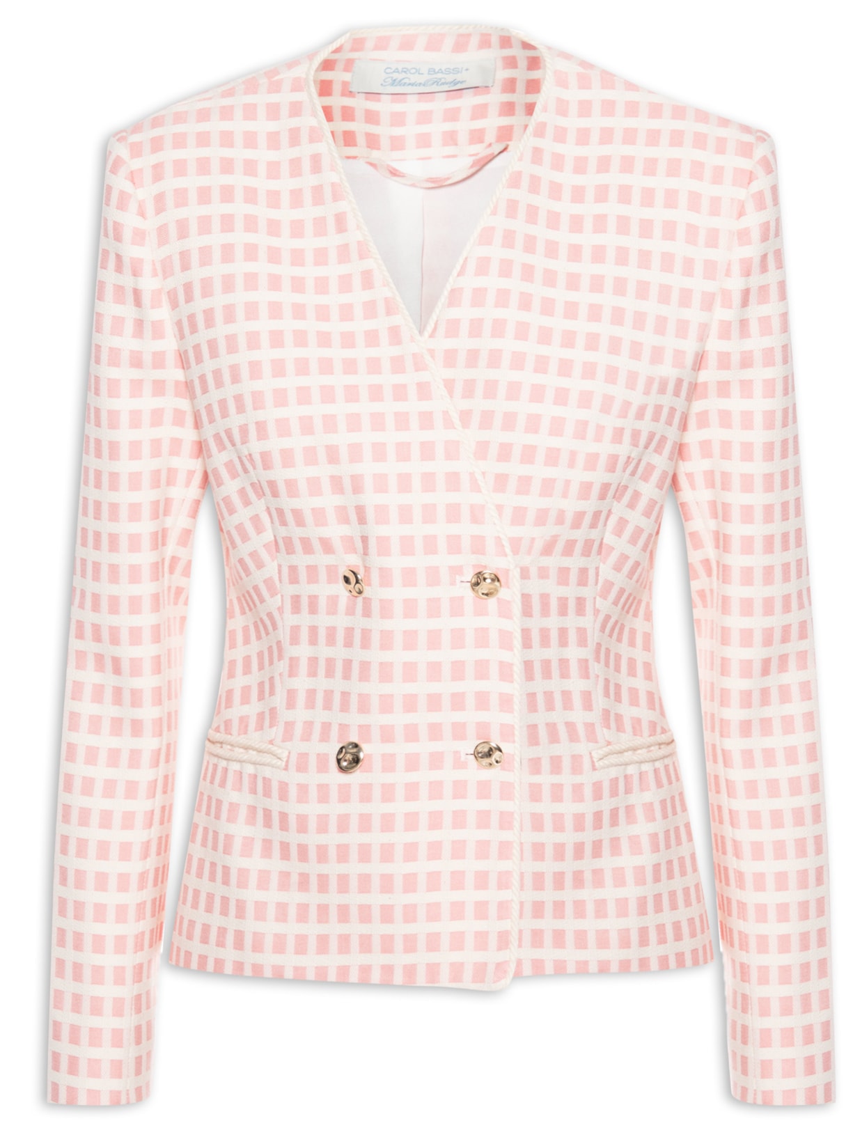 O blazer rosa é confeccionado em tecido encorpado com superfície texturizada. A peça possui decote V, ombreiras embutidas, mangas longas, pences frontais, bolsos frontais decorativos, padronagem quadriculada em cor contrastante, bordas e bolsos com aplicação de cordões aplicados, shape justo, caimento reto, acabamento pespontado e fechamento frontal por botões metalizados.