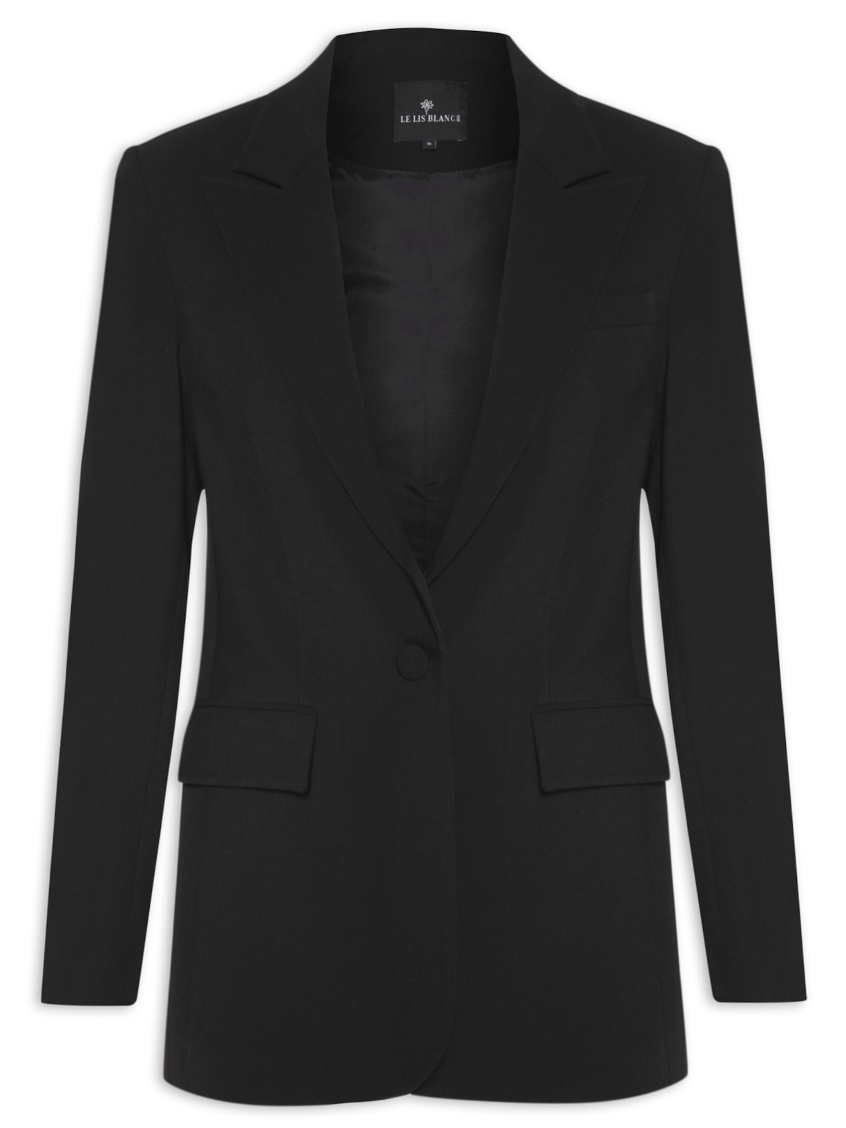 O blazer preto é confeccionado em tecido leve de baixa elasticidade. A peça solta ao corpo, possui lapela chanfrada, ombros estruturados com ombreiras embutidas, mangas longas com abotoamento nos punhos, bolso frontal embutido na altura do busto, bolsos frontais embutidos com aba, tag metálica da marca aplicada na parte posterior do decote, recorte posterior com fenda, forro e fechamento frotnal por botão.