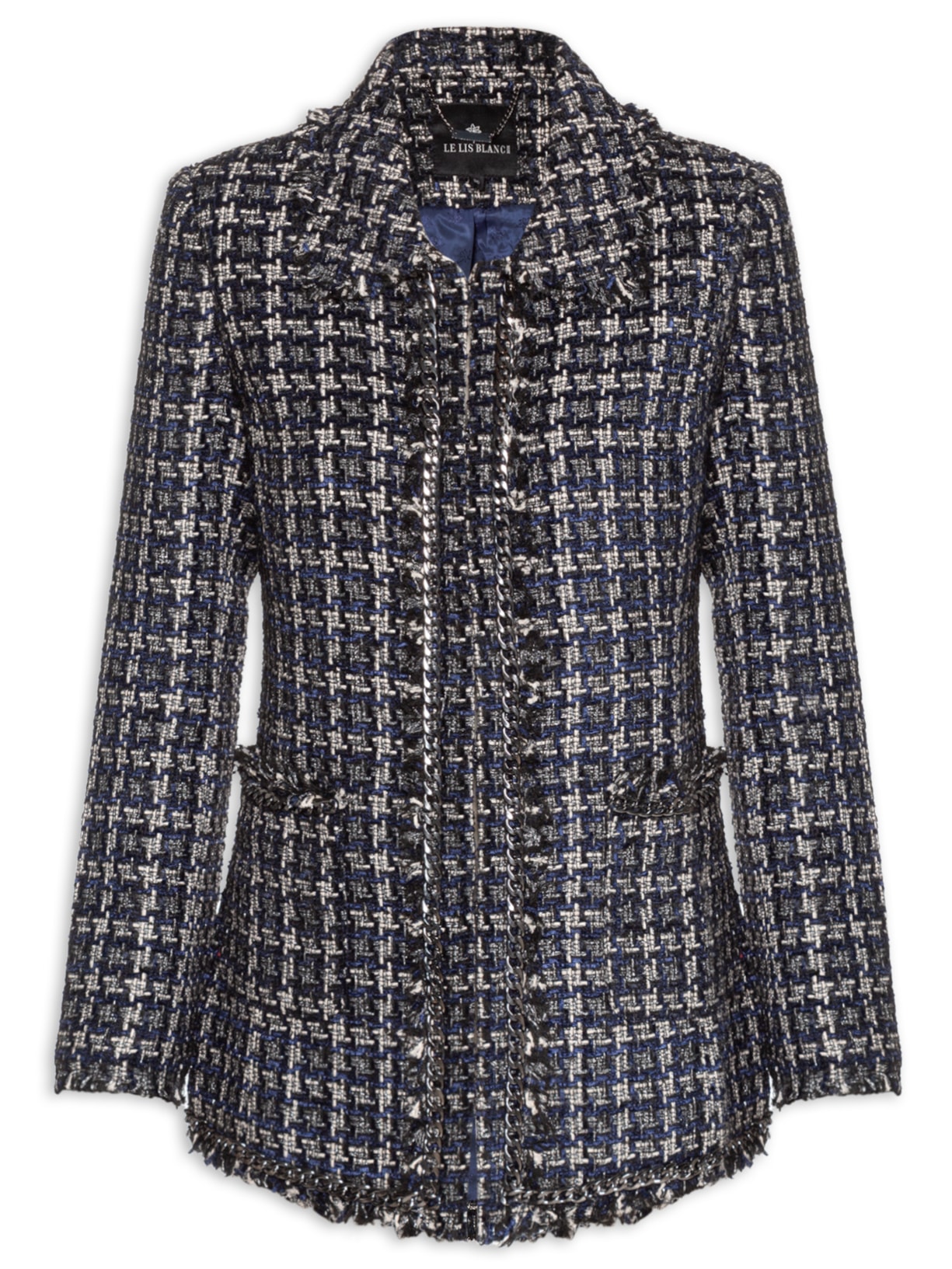 O blazer azul é confeccionada em tweed elasticidade. A peça solta ao corpo possui colarinho clássico, mangas longas com recorte nos punhos, bolsos frontais, padronagem xadrez em cores contrastantes, correntes metalizadas aplicadas na parte frontal e na barra e forro.