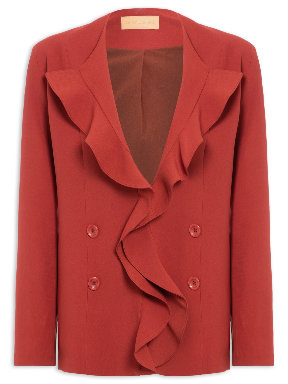 O blazer marrom é confeccionado em crepe de viscose. A peça possui lapela xale com babados aplicados, mangas longas, ombreiras aplicadas, bolsos frontais embutidos, botões decorativos aplicados na parte frontal, detalhe de recortes, caimento reto, forro, acabamento pespontado e fechamento frontal por colchete.