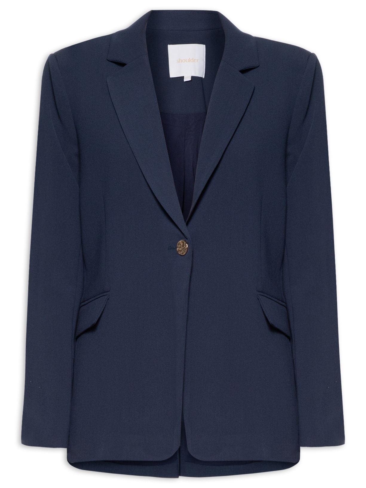 O blazer azul marinho é confeccionado em tecido leve sem elasticidade. A peça solta ao corpo possui lapela chanfrada, mangas longas com abotoamento nos punhos, ombreira, recortes posteriores, pences frontais, forro, bolsos frontais decorativos com vistas sobrepostas e fechamento frontal por botão.