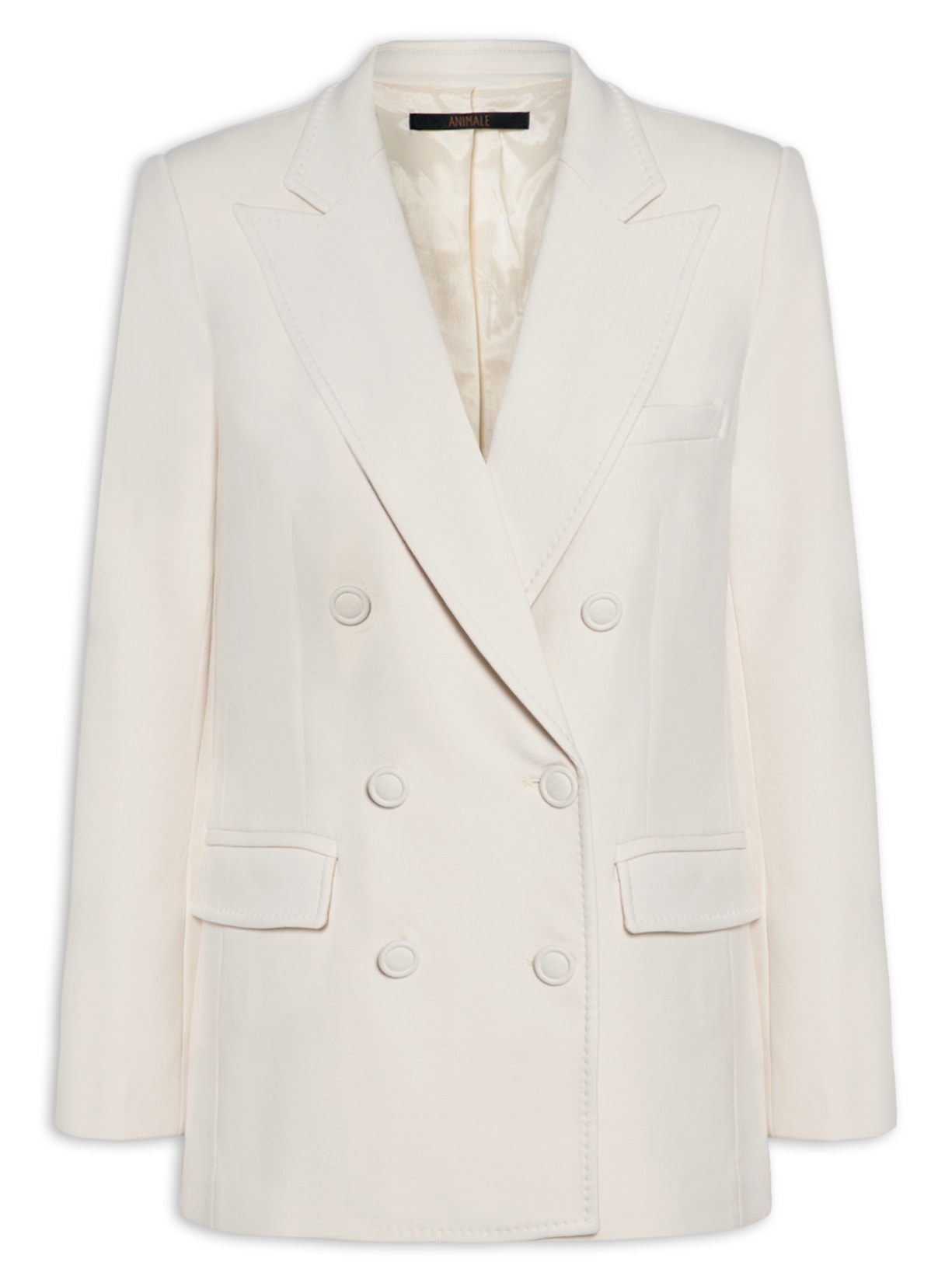 O blazer bege é confeccionado em tecido encorpado de baixa elasticidade. A peça solta ao corpo, possui lapela com detalhe pespontado, ombros estruturados com ombreiras embutidas, mangas longas com abotoamento nos punhos, recortes frontais, bolsos frontais embutidos, recortes posteriores com detalhe pespontado, fenda posterior, comprimento longo, forro e fechamento frontal por botões.
