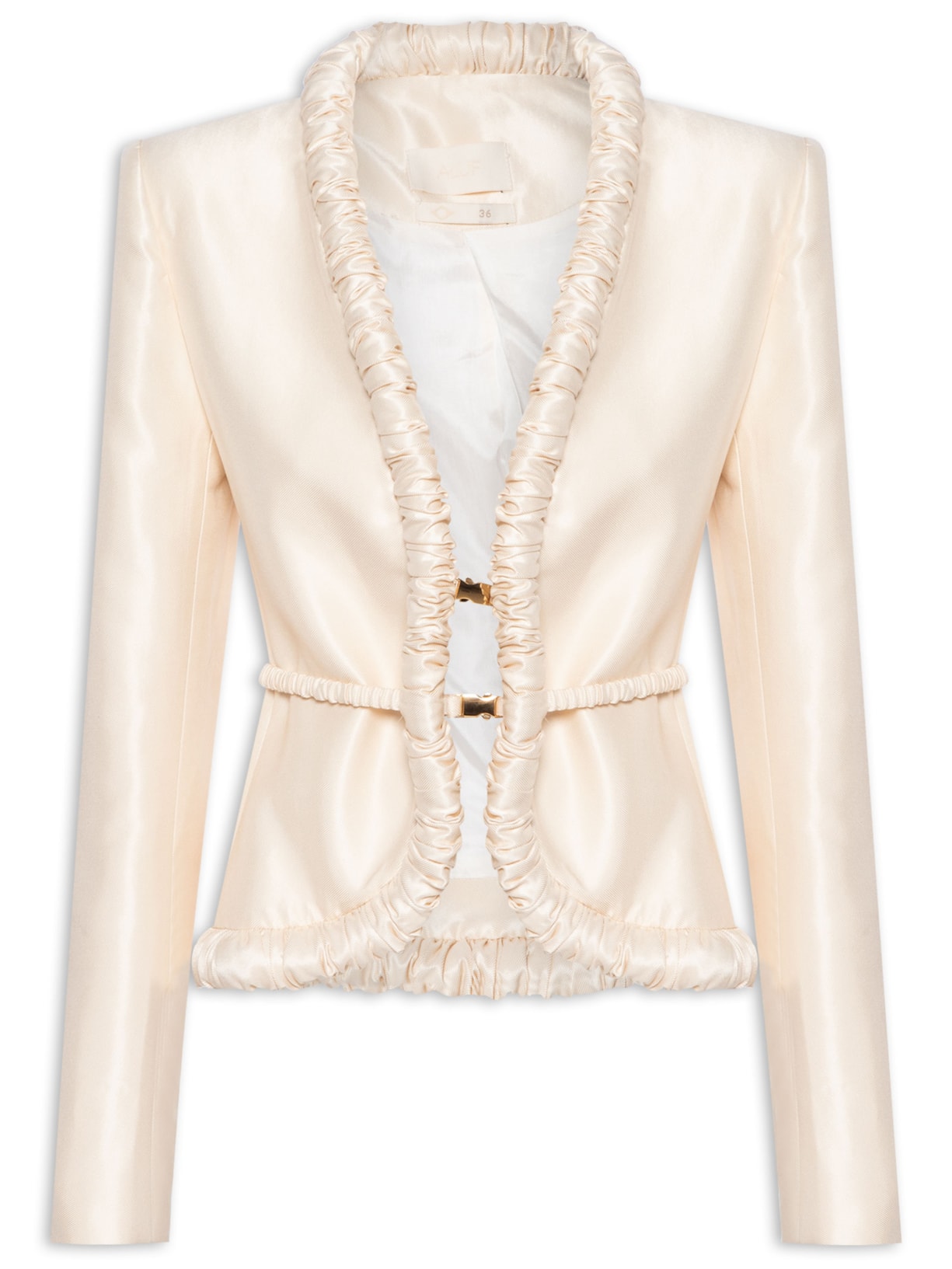 O blazer bege é confeccionado em tecido leve com superfície acetinada e sem elasticidade. A peça solta ao corpo possui ombros embutidos, mangas longas, forro, acabamento em vivo acolchoado com efeito drapeado e fechamento frontal por fecho engate metálico. Acompanha cinto fino da mesma cor e tecido com elástico embutido com fechamento por engate para encaixe na parte frontal e uso opcional.