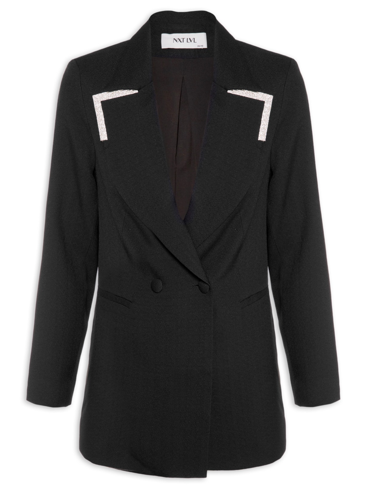 O blazer preto é confeccionado em tecido encorpado. A peça possui lapela chanfrada com detalhe de strass e abotoamento, mangas longas com botões decorativos nos punhos, bolsos frontais decorativos, forro, shape solto, caimento reto, acabamento pespontado e fechamento frontal por botões.