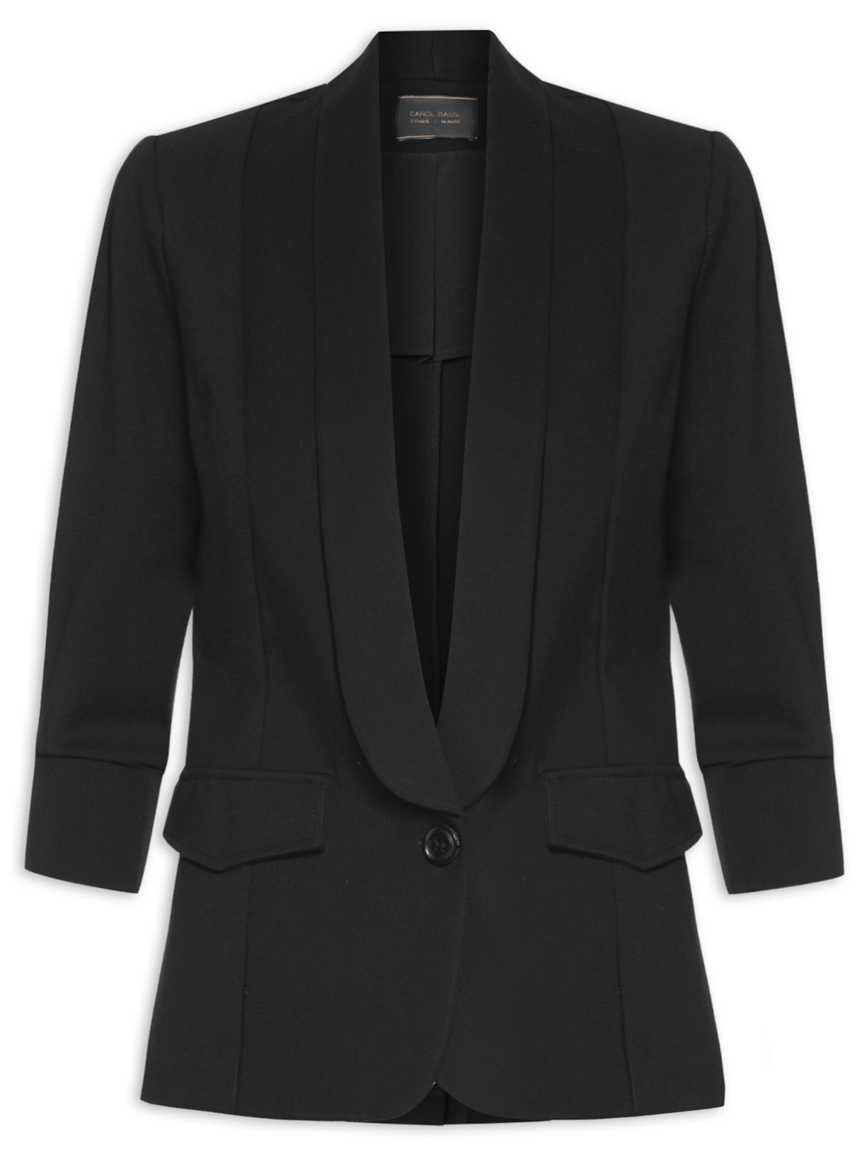 O blazer preto é confeccionado em malha encorpada com média elasticidade. A peça solta ao corpo possui lapela xale, mangas 3/4 com ajuste nos punhos, ombreira, recorte posterior com fenda, recortes frontais, vistas sobrepostas na parte frontal, forro e fechamento frontal por botão.