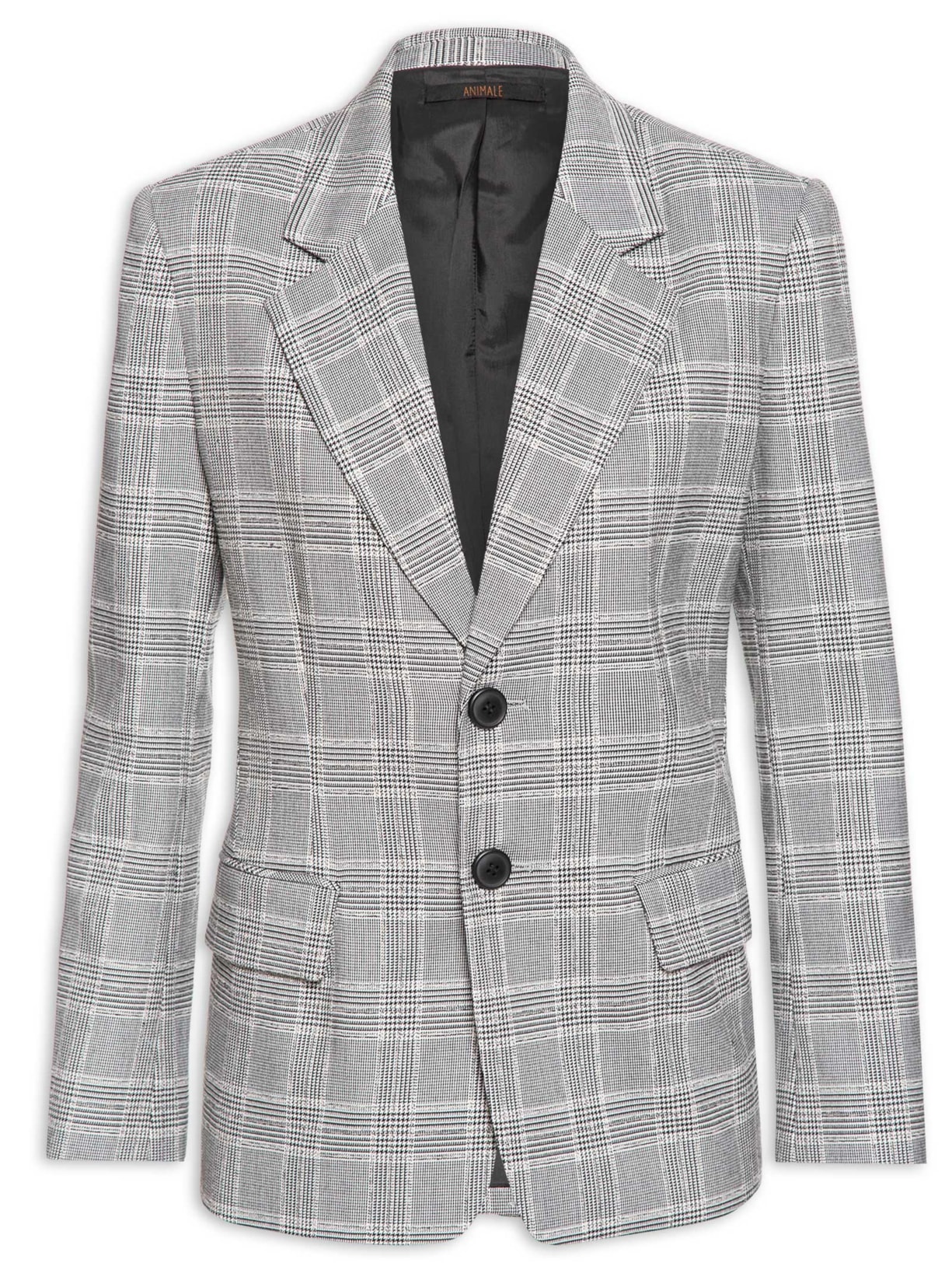 O blazer cinza é confeccionado em tecido rígido sem elasticidade. A peça solta ao corpo possui decote em V com lapela, mangas longas com abotoamento nos punhos, recortes frontais, bolsos decorativos frontais, recortes posteriores, fenda posterior, padronagem xadrez príncipe de Gales, comprimento longo, forro e fechamento frontal por botões