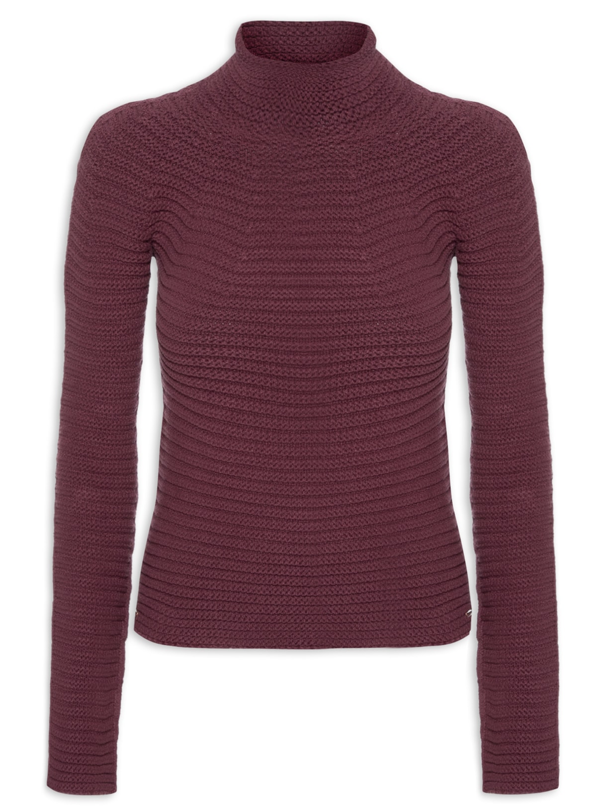 A blusa vinho é confeccionada em tricot com superfície texturizada e alta elasticidade. A peça justa ao corpo possui gola alta, mangas longas e tag metalizada da marca aplicada na parte frontal da barra.