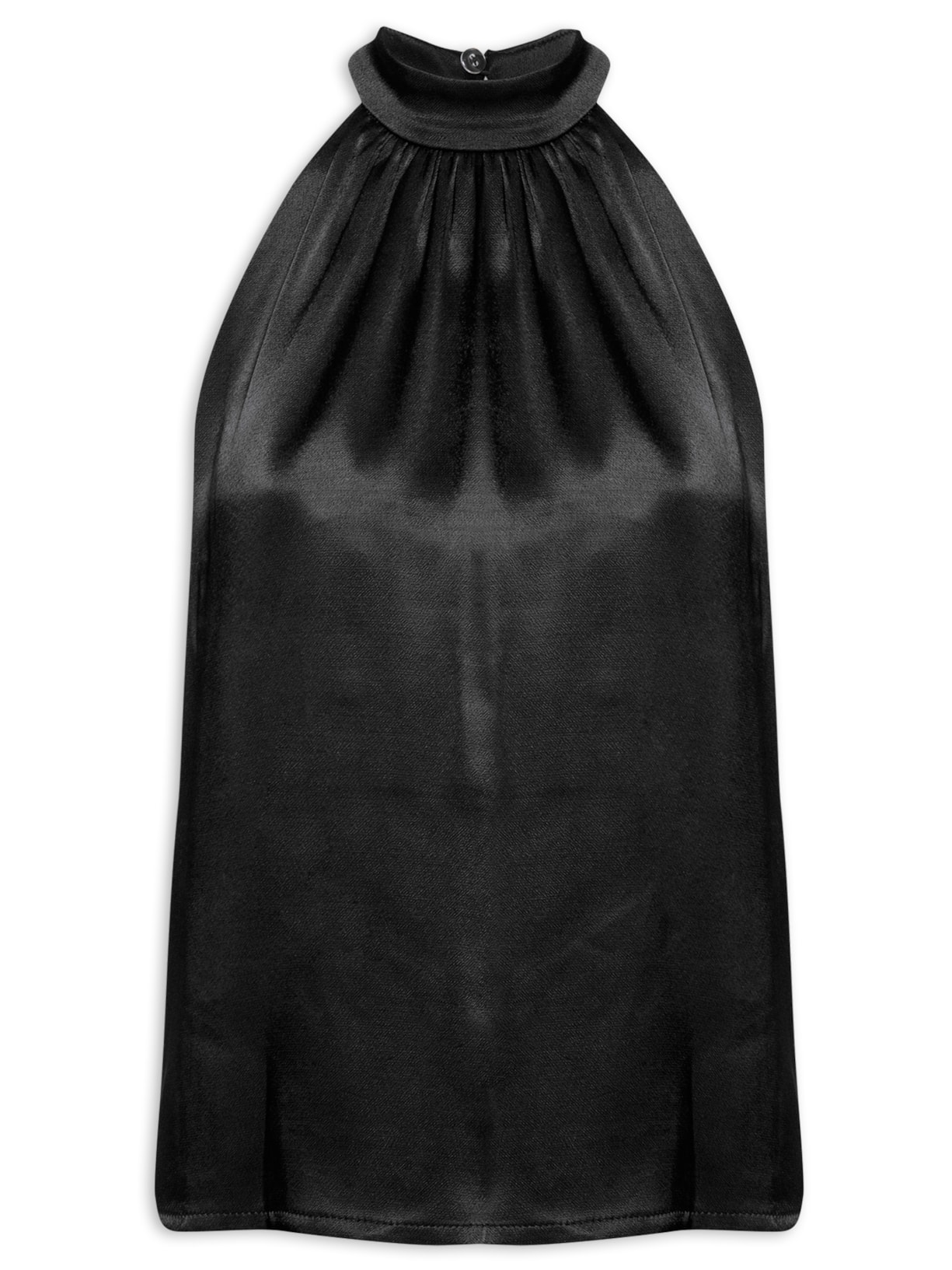 A blusa preta é confeccionada em tecido leve sem elasticidade. A peça solta ao corpo possui gola alta com detalhe de franzido, meio forro e recorte posterior vazado com botões aplicados.