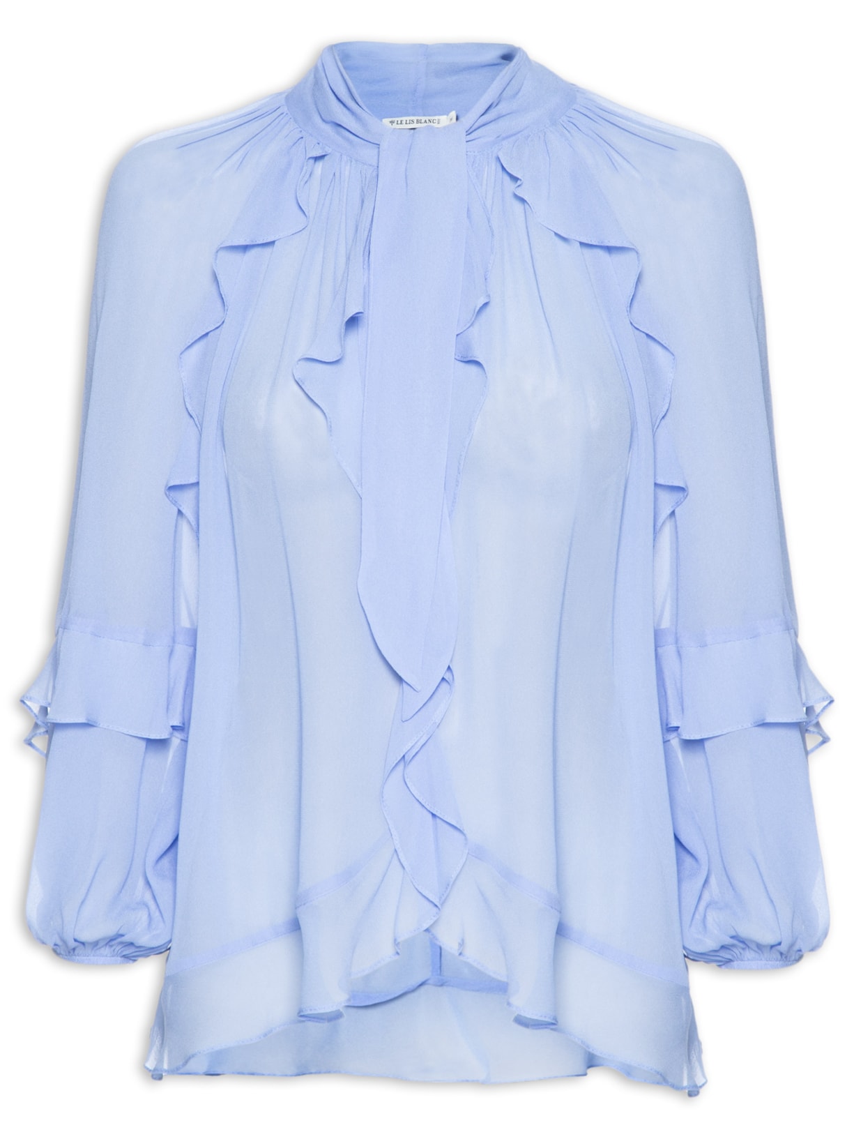 A blusa azul é confeccionada em tecido leve sem elasticidade. A peça solta ao corpo possui decote v profundo com babados aplicados e faixas aplicadas para amarração frontal, mangas 7/8 de modelo raglan com elástico embutido nos punhos, tag da marca metalizada aplicada na parte posterior, leve transparência e babados aplicados nas mangas, barra, parte posterior e frontal.