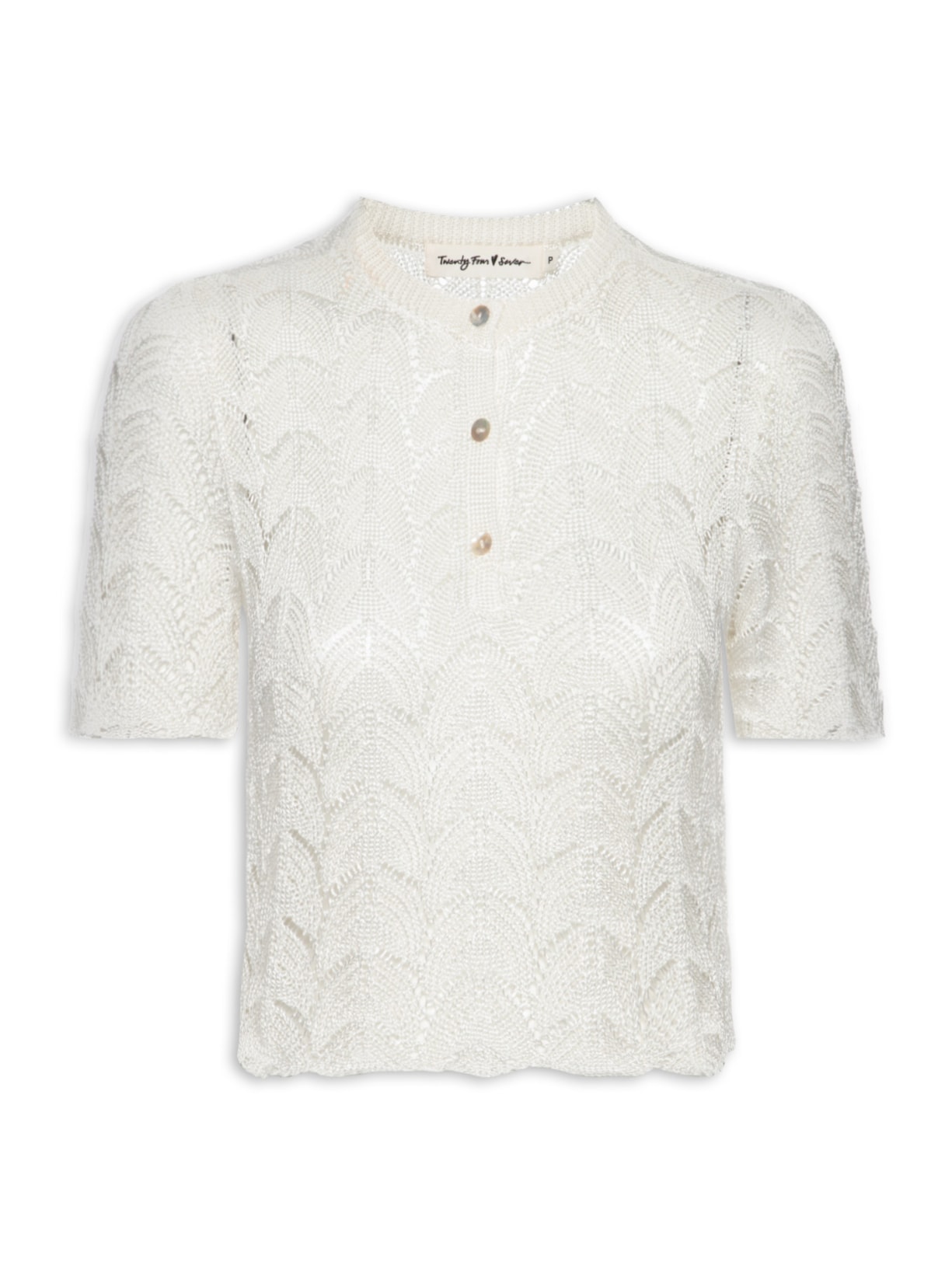 A blusa branca é confeccionada em tricot de média elasticidade. A peça solta ao corpo, possui gola portuguesa, mangas curtas, padronagem com trama aberta, leve transparência, acabamento das mangas e barra ondulado, comprimento cropped* e fechamento frontal por botões.