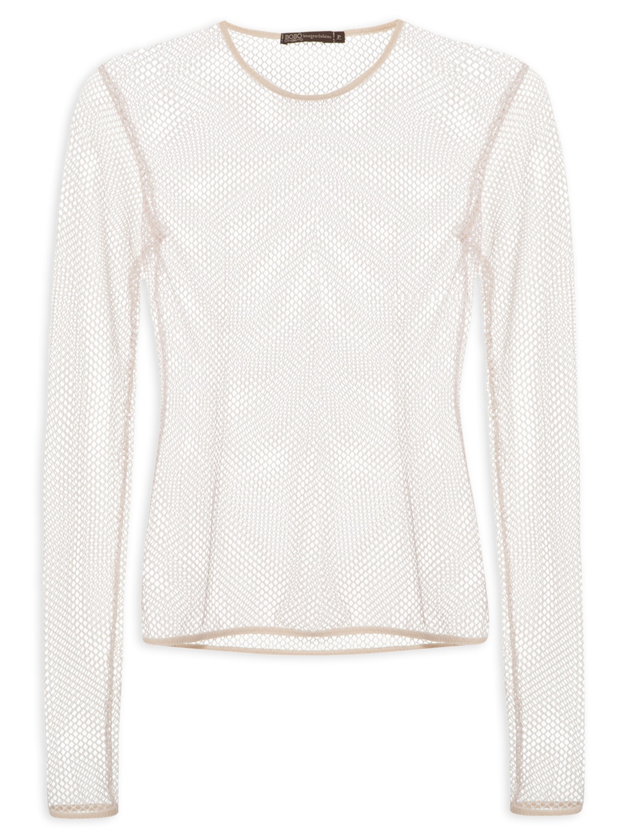 A blusa bege é confeccionada em tela com alta elasticidade. A peça justa ao corpo possui decote redondo com tag da marca metalizada na parte posterior, mangas longas, transparência e acabamento elástico.