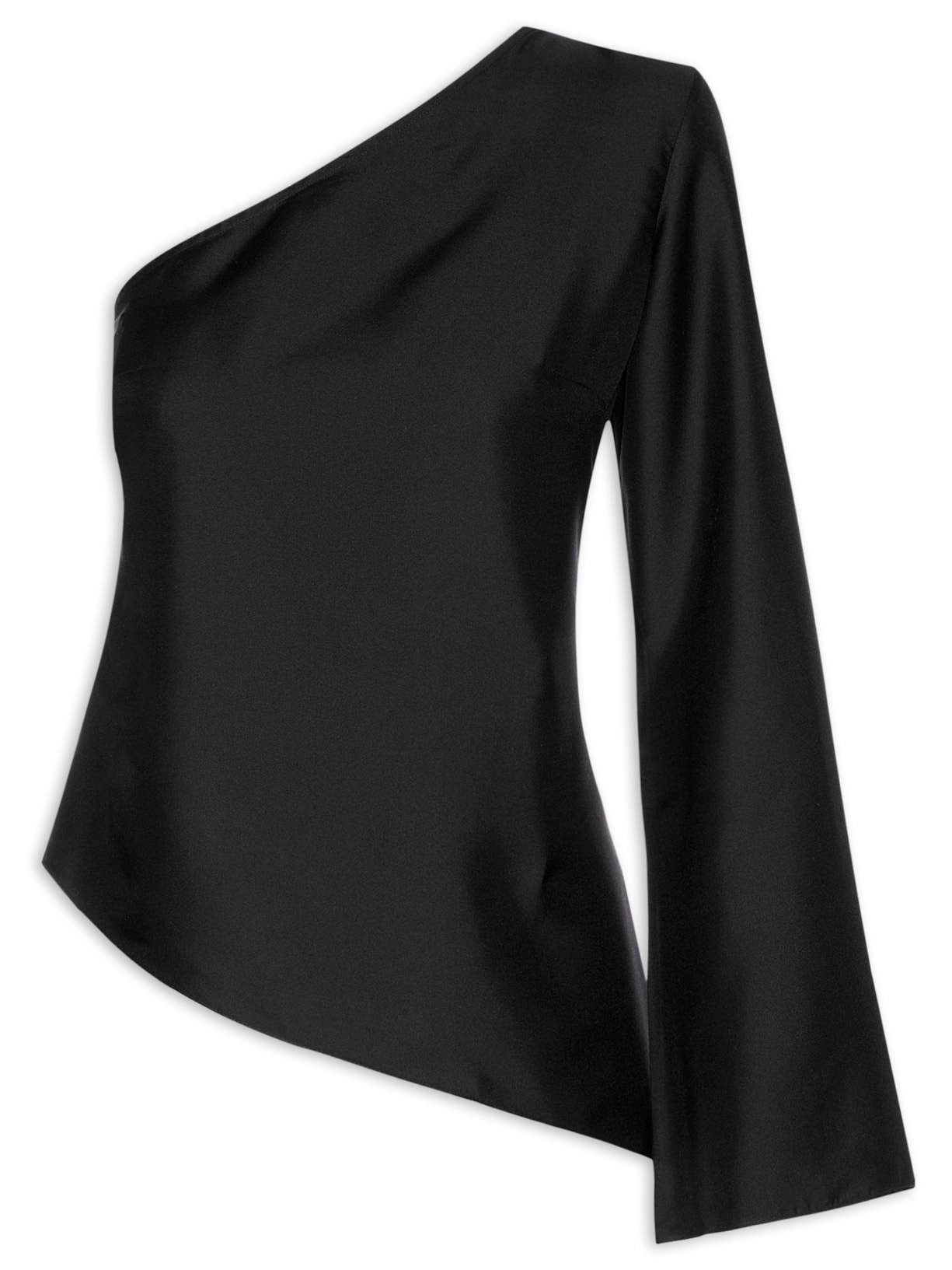A blusa preta é confeccionada em seda sem elasticidade. A peça solta ao corpo de modelo ombro único possui decote assimétrico, recortes frontais, manga longa de modelo sino e barra assimétrica.