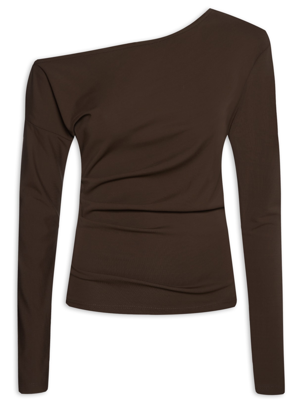 A blusa marrom é confeccionada em malha de baixa elasticidade. A peça solta ao corpo possui decote assimétrico, mangas longas, drapeado frontal e posterior, fenda lateral com fechamento por zíper, tag metálica da marca aplicada na parte posterior.