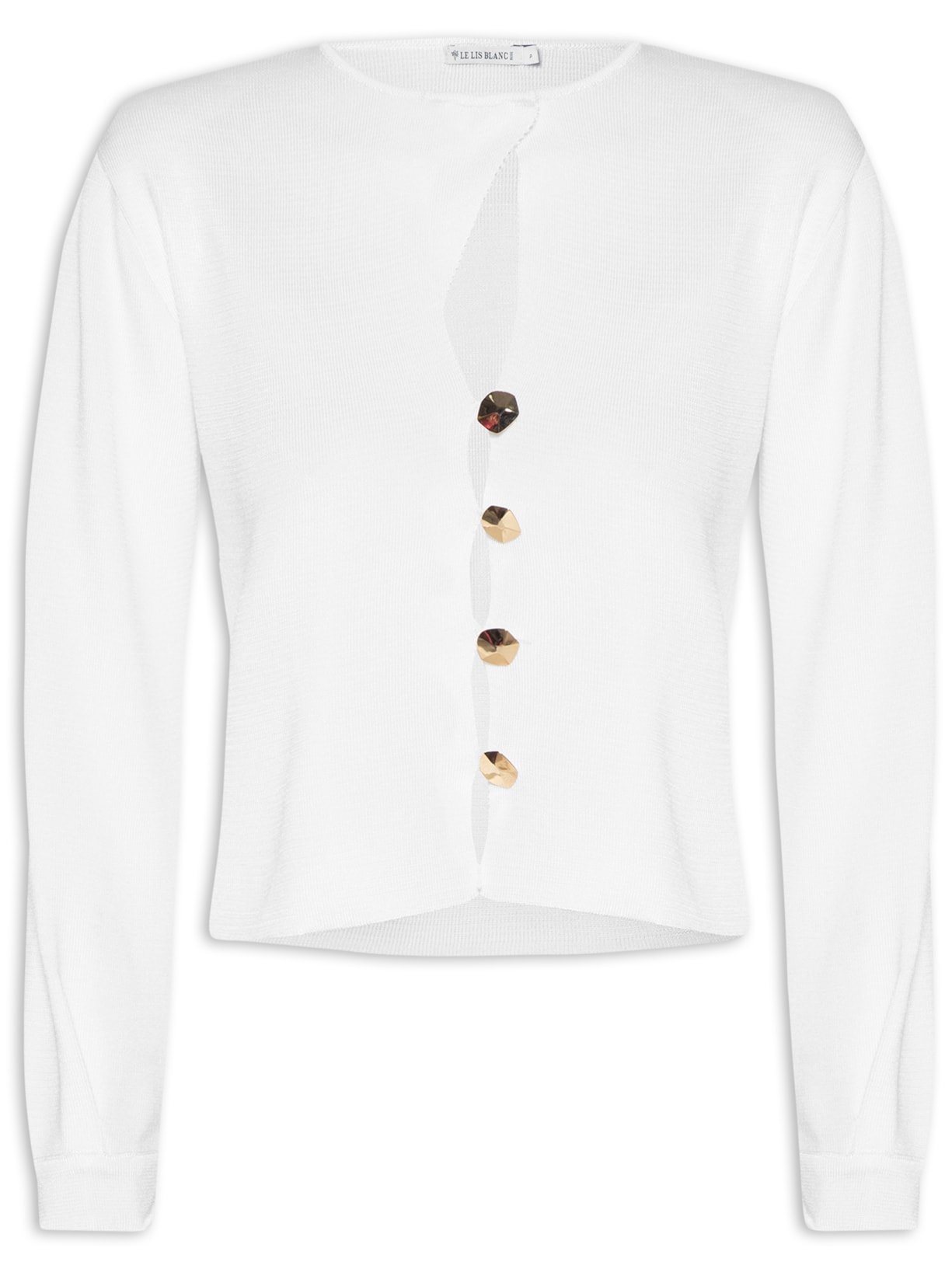 A blusa branca é confeccionada em tricot de alta elasticidade. A peça solta ao corpo possui decote redondo, mangas longas com detalhe de pregas nos punhos, recorte frontal vazado, tag metalizada da marca aplicada na parte frontal, comprimento cropped* e fechamento frontal em botões metalizados.