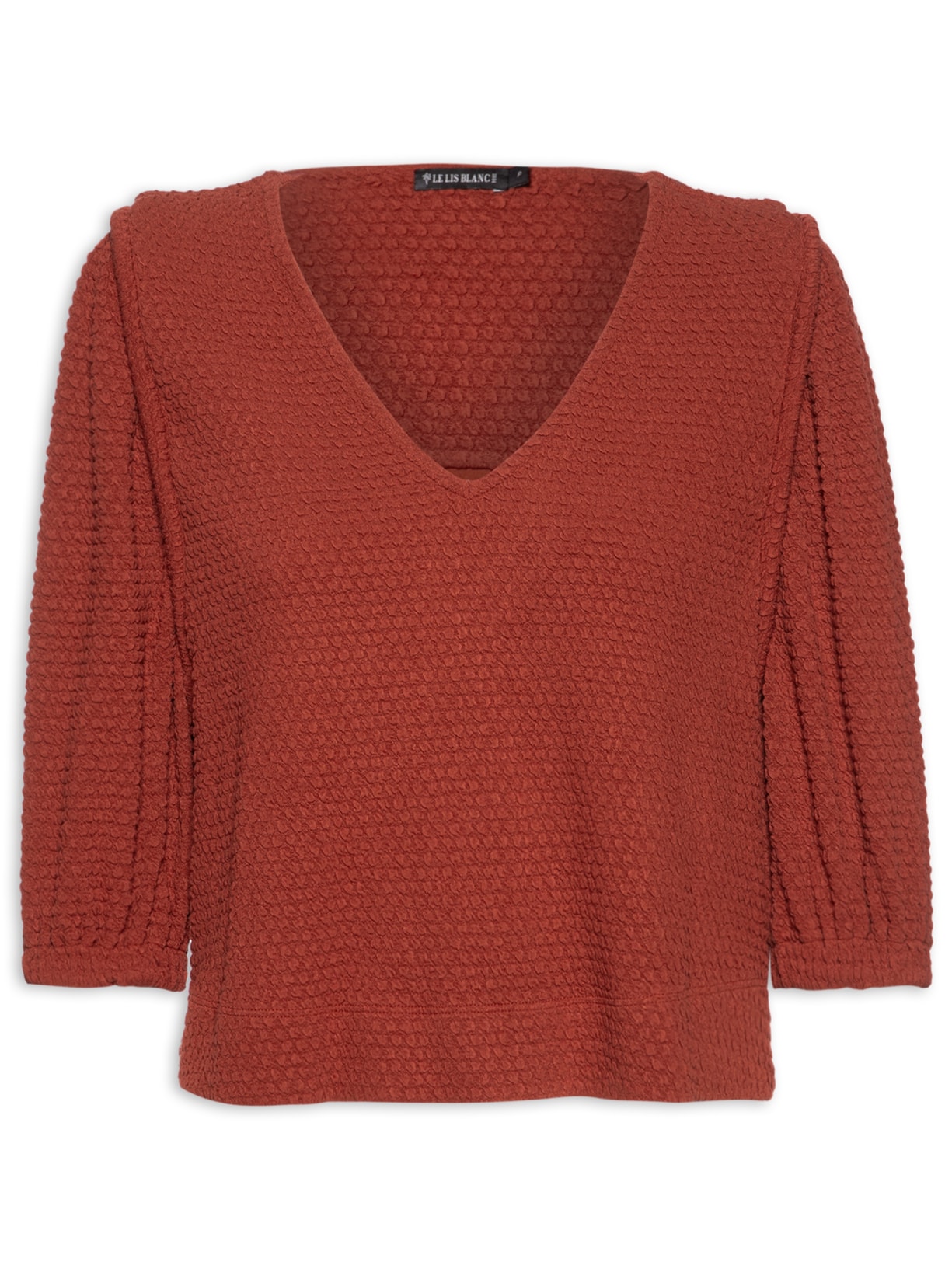 A blusa laranja é confeccionada em tecido leve com superfície texturizada com alta elasticidade. A peça solta ao corpo possui devote V, mangas longas com elástico embutido no punho, recorte posterior e tag da marca aplicada na gola posterior.