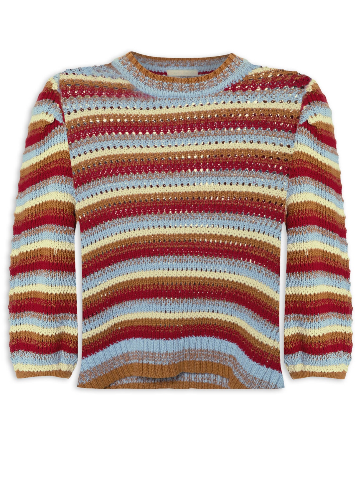 A blusa vermelha é confeccionada em tricot encorpado. A peça possui decote redondo, mangas 3/4 bufantes, padronagem de listras em cores contrastantes e shape solto.