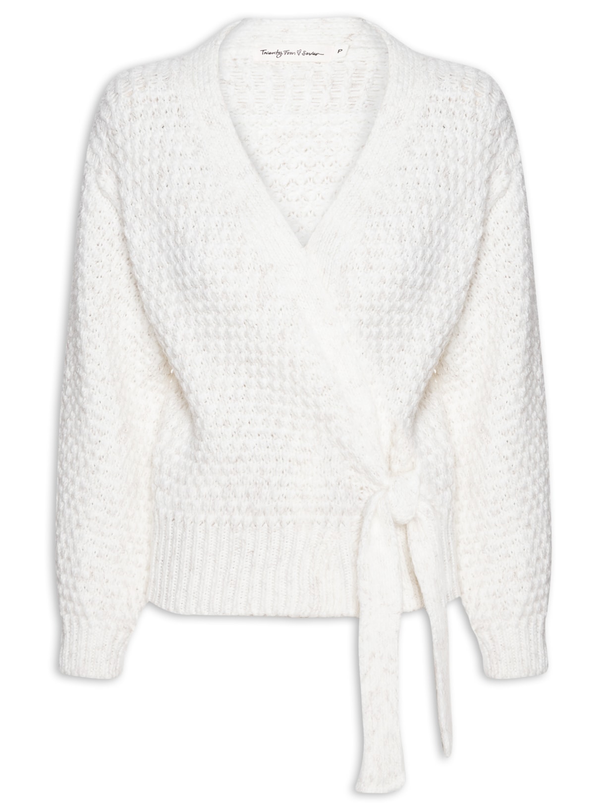 A blusa branca é confeccionada em tricot com baixa elasticidade. A peça solta ao corpo possui decote V transpassado, mangas longas com acabamento canelado nos punhos, ombros estendidos, faixas aplicadas nas laterais para amarração e acabamento canelado na barra.