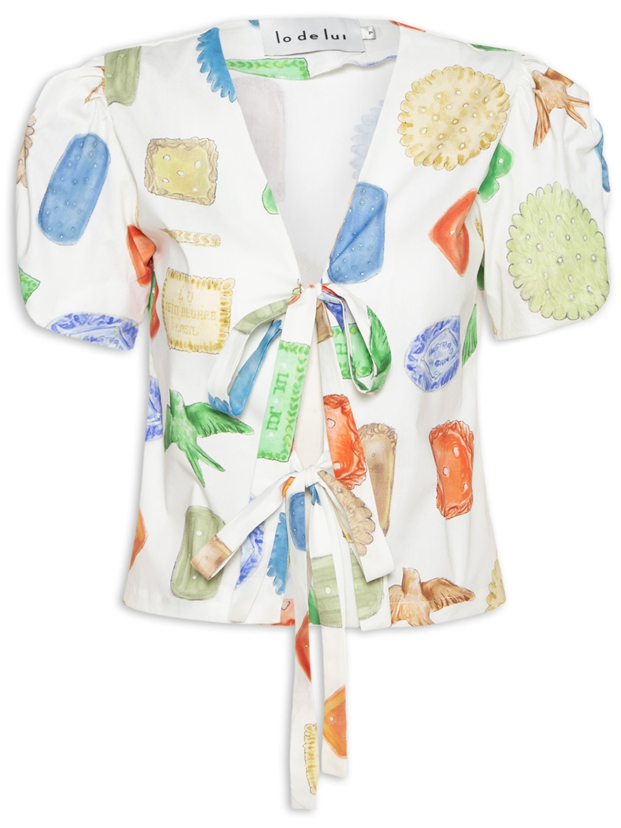 A blusa off white é confeccionada em tecido leve sem elasticidade. A peça solta ao corpo possui decote V, mangas curtas bufantes com detalhe de recorte franzido na parte superior, mix de estampas em cores contrastantes e fechamento frontal em tiras alongadas para amarração.