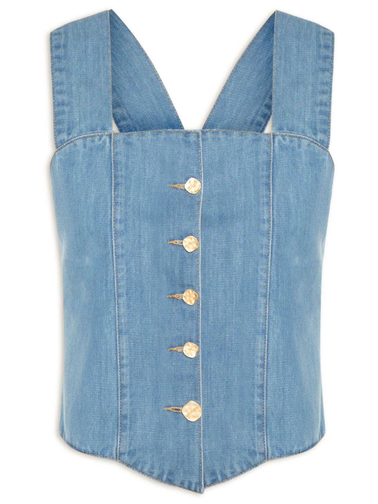 A blusa azul é confeccionada em sarja com lavagem jeans sem elasticidade. A peça solta ao corpo, possui decote quadrado, alças largas, recortes frontais, decote em V posterior, recortes posteriores com detalhe aplicado em padronagem listrada de cores contrastantes, barra assimétrica frontal e posterior, forro e fechamento frontal por botões metálicos.