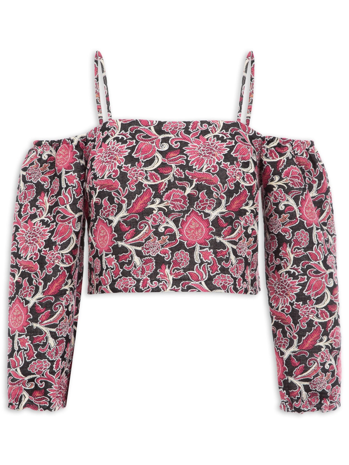 A blusa preta é confeccionada em jacquard. A peça possui decote ombro a ombro, alças finas, mangas longas bufantes com elástico embutido nos punhos, mix de estampas em cor contrastante, caimento reto, comprimento cropped, acabamento pespontado e fechamento lateral por zíper invisível.