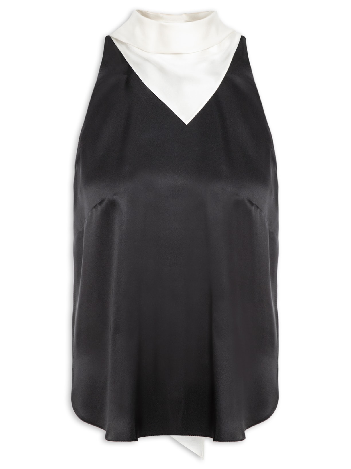 A blusa preta é confeccionada em cetim de seda sem elasticidade. A peça solta ao corpo, possui decote redondo com abotoamento posterior, alças finas, cavas estendidas, detalhe aplicado ao decote para amarração posterior em cor contrastante, fendas laterais e barra mullet* arredondada.