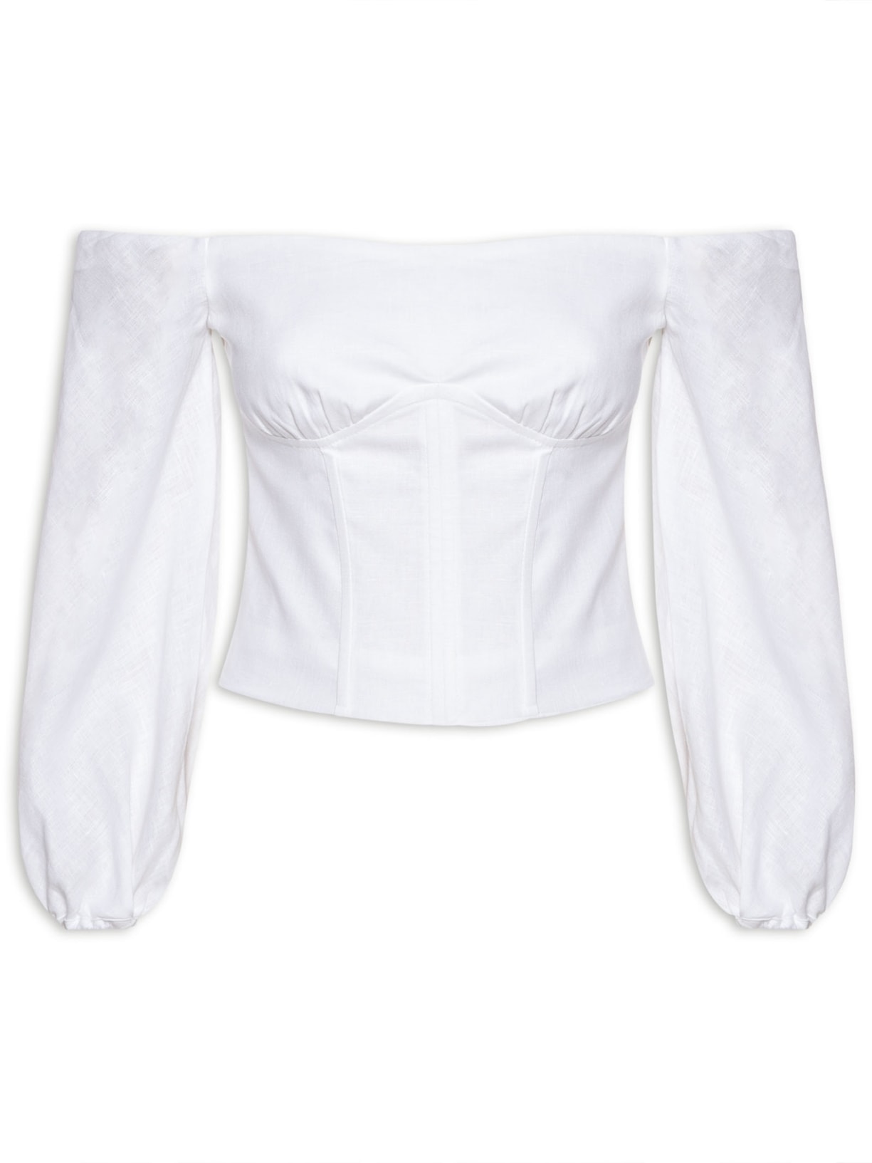A blusa off white é confeccionada em linho sem elasticidade. A peça justa ao corpo, possui decote ombro a ombro, angas bufantes longas com elástico aplicado no ombro e no punho, recortes frontais com aros embutidos, franzido na parte frontal, recortes posteriores com aros embutidos, comprimento médio, forro e fechamento posterior por zíper metálico.