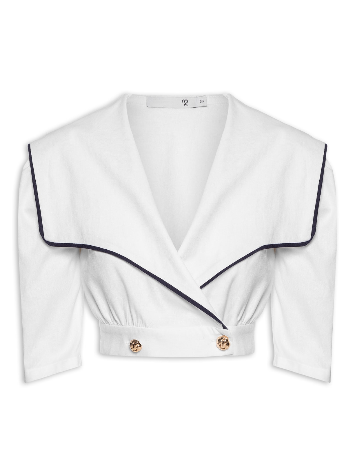 A blusa branca é confeccionada em tecido leve com toque de linho. A peça solta ao corpo possui decote em V profundo com pala sobreposta nas partes frontal e posterior, detalhe de frisos em cor contrastante, mangas curtas, comprimento cropped* e fechamento frontal por botões.