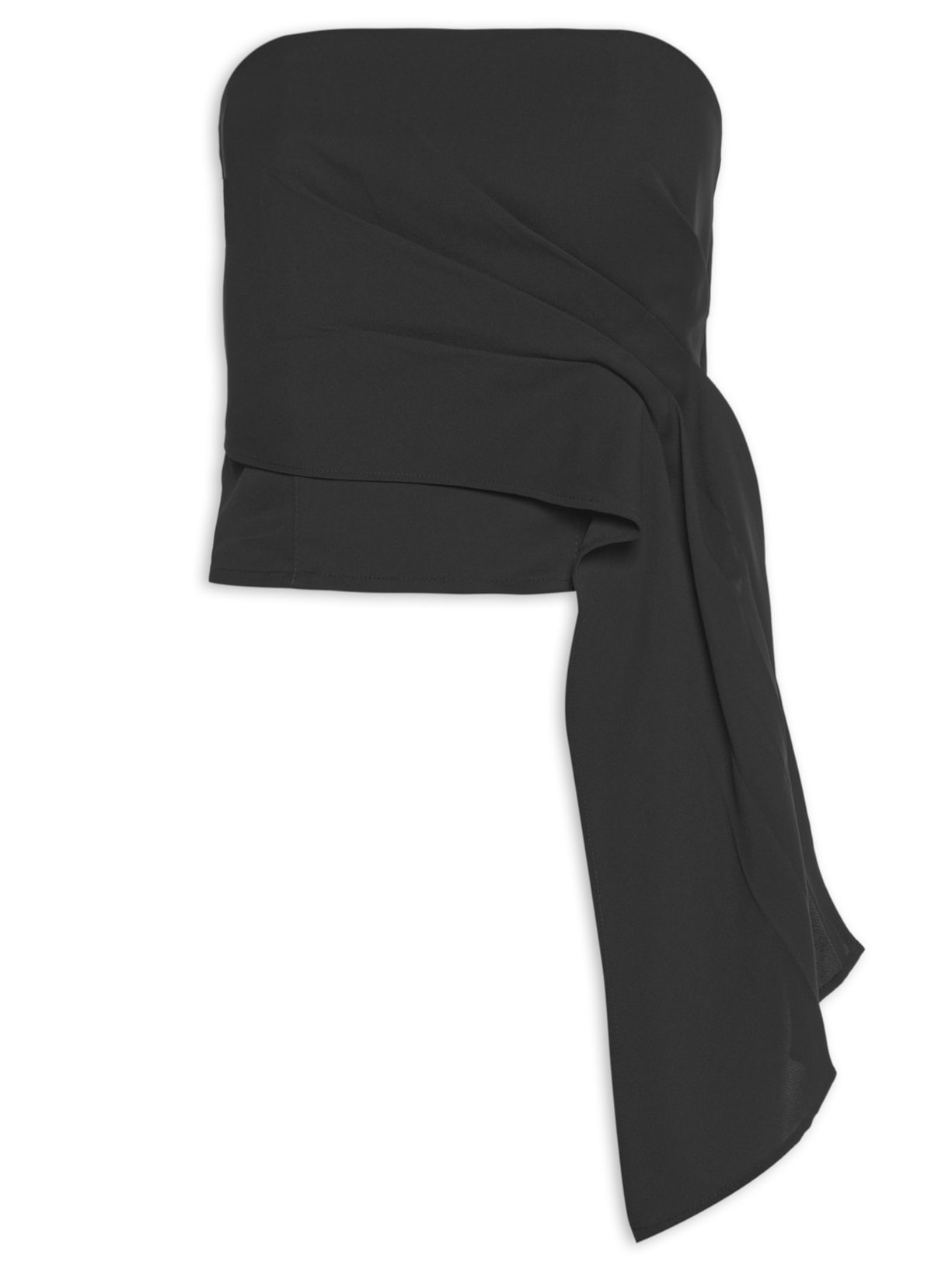 A blusa preta é confeccionada em tecido leve sem elasticidade. A peça de modelo tomara que caia justa ao corpo possui decote reto, efeito drapeado na parte frontal com recorte sobreposto alongado, recortes posteriores e fechamento lateral por zíper.