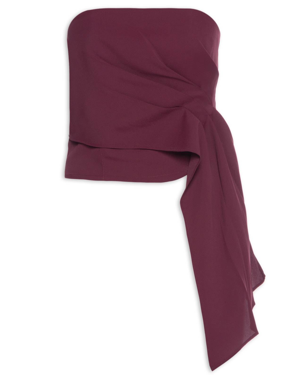 A blusa vinho é confeccionada em tecido leve sem elasticidade. A peça de modelo tomara que caia justa ao corpo possui decote reto, efeito drapeado na parte frontal com recorte sobreposto alongado, recortes posteriores e fechamento lateral por zíper.