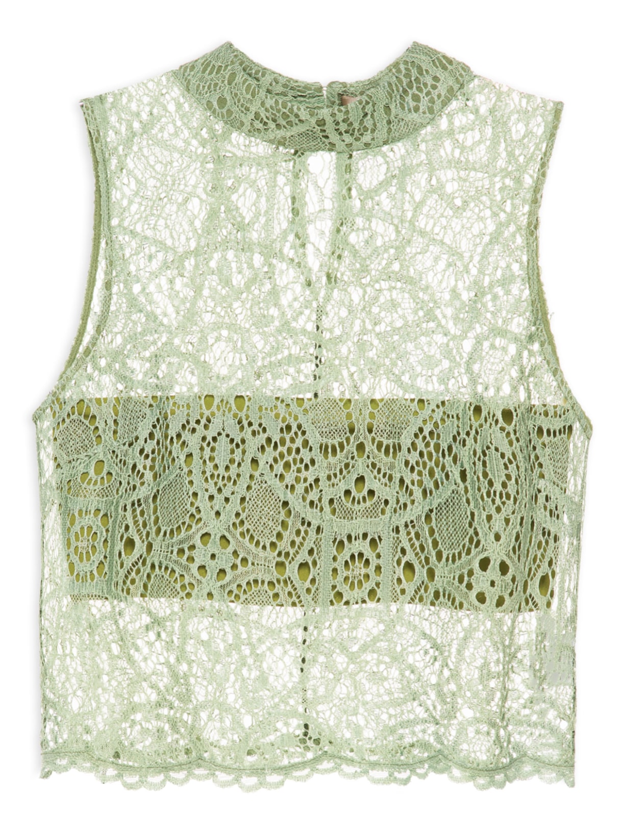 A blusa verde é confeccionada em renda. A peça possui gola alta com abotoamento posterior e recorte vazado, cavas regulares, transparência, caimento reto, comprimento cropped*, shape solto e acabaento pespontado. Acompanha top tomara que caia em malha de mesma cor com acabamento elástico.