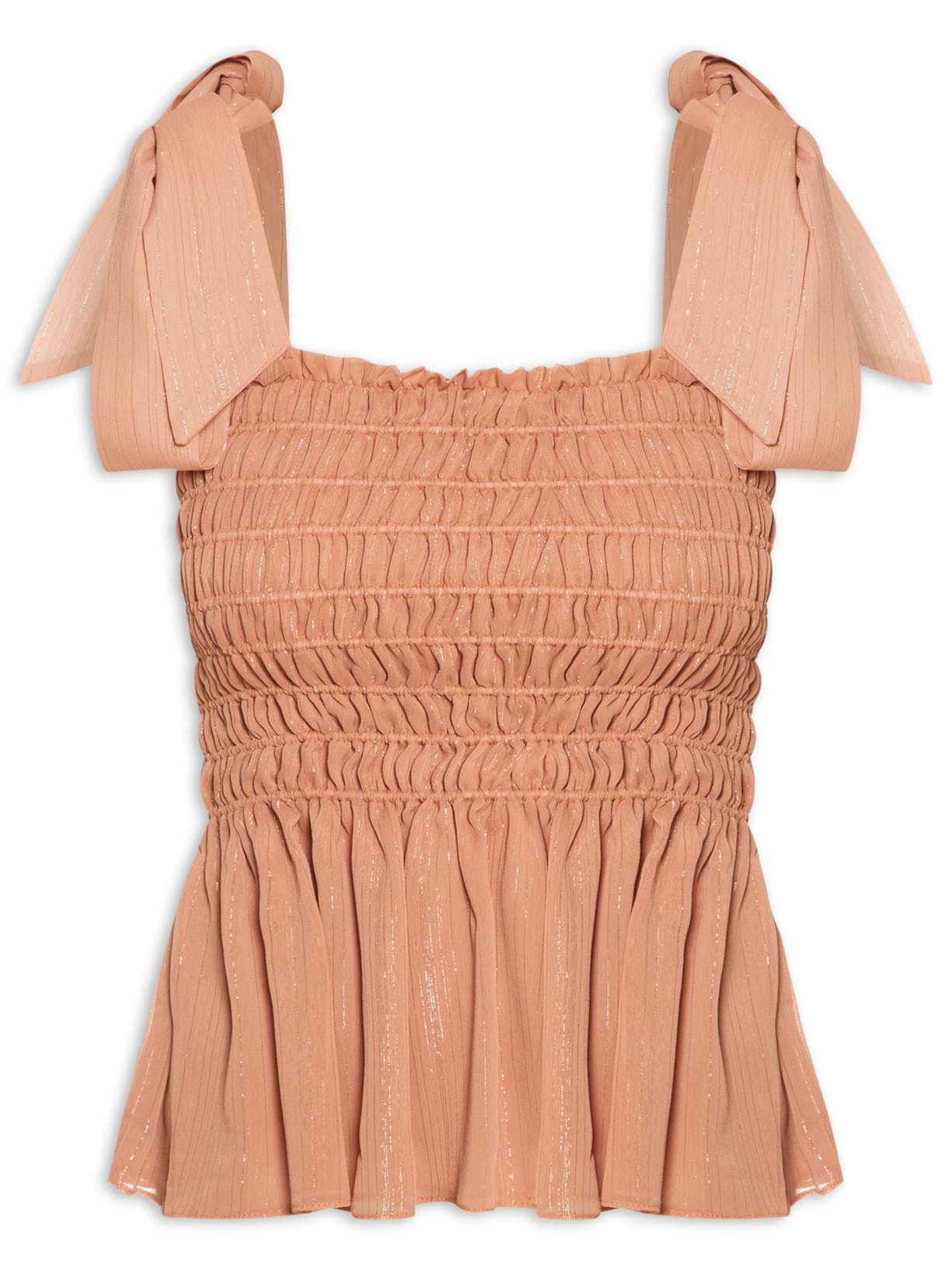 A blusa rosa é confeccionada em tecido leve com superfície em fios de lurex. A peça possui decote reto, alças médias ajustáveis por amarração, lastex na altura do busto, shape justo, caimento reto e acabamento pespontado.