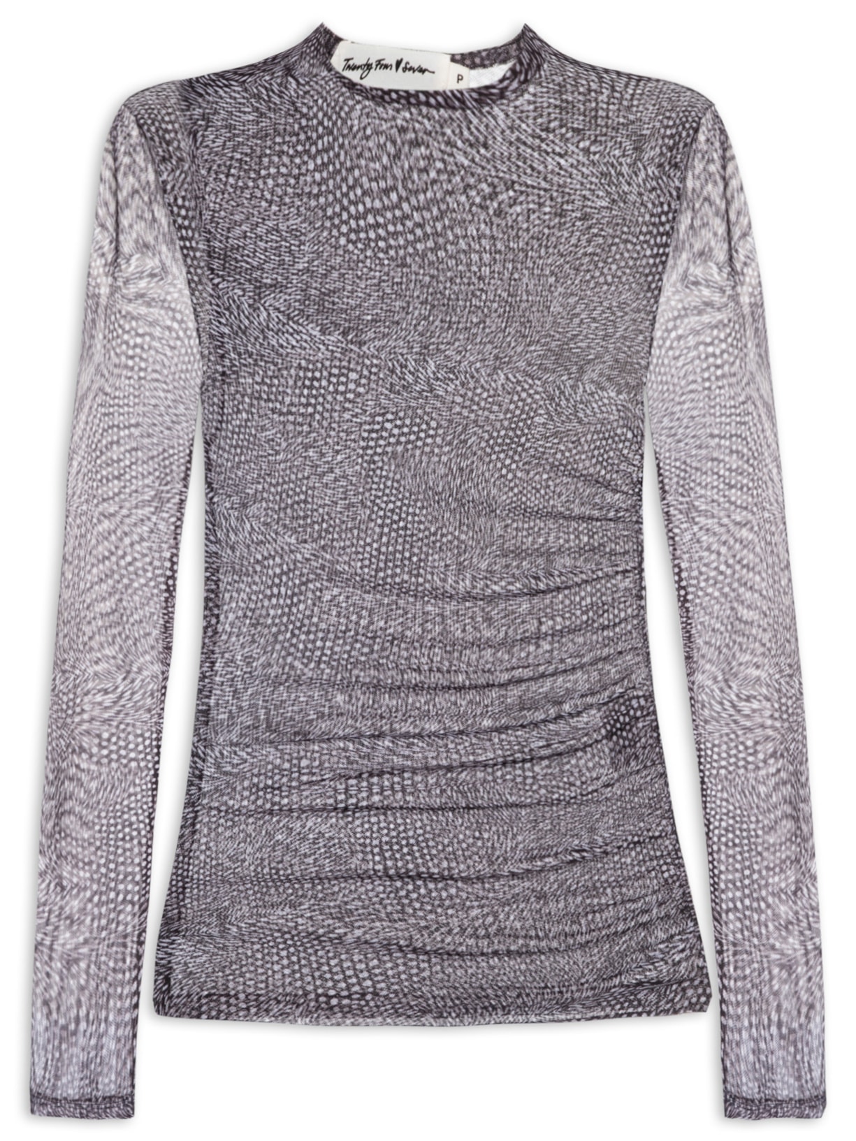 A blusa preta é confeccionada em tule de média elasticidade. A peça justa ao corpo, possui decote redondo assimétrico, ombro franzido, mangas longas, lateral com pregas e elástico embutido, estampa abstrata em cores contrastantes, leve transparência e forro frontal.