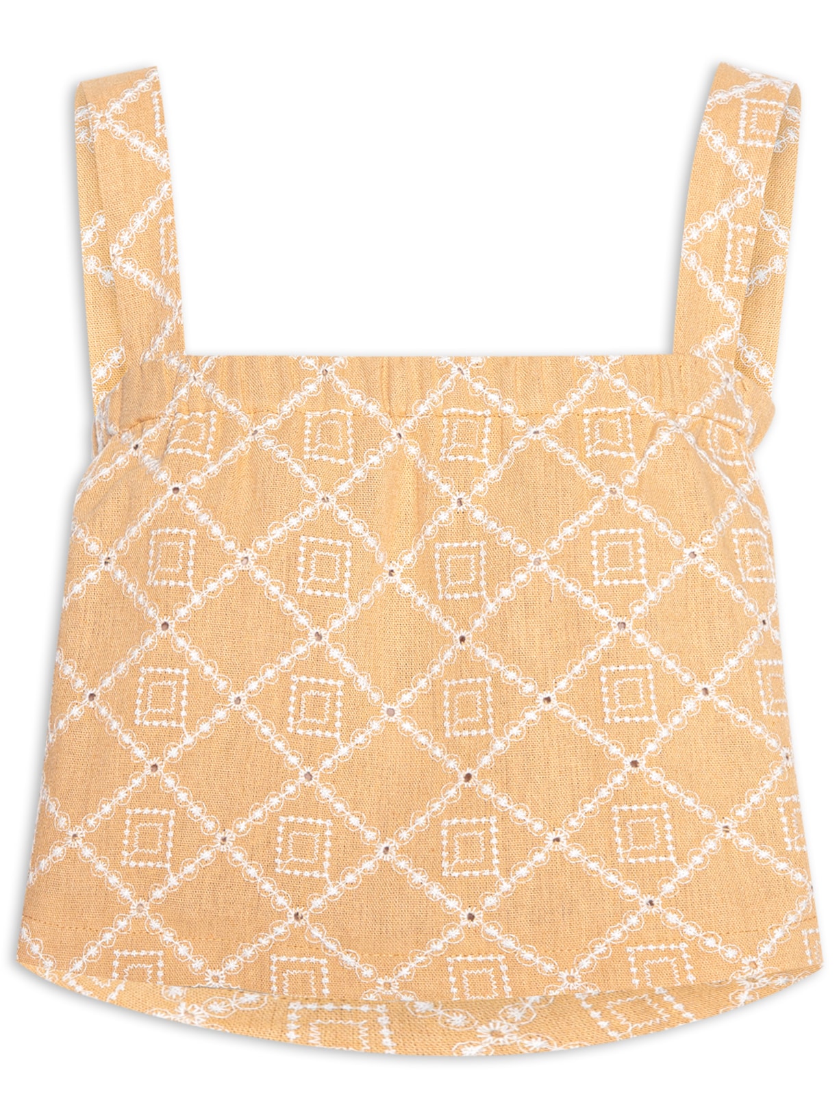 A blusa bege é confeccionada em tecido leve com toque de linho. A peça solta ao corpo, possui decote quadrado com elástico embutido, alças largas, bordado abstrato em cor contrastante, perfuros, leve transparência posterior, comprimento cropped* e forro frontal.