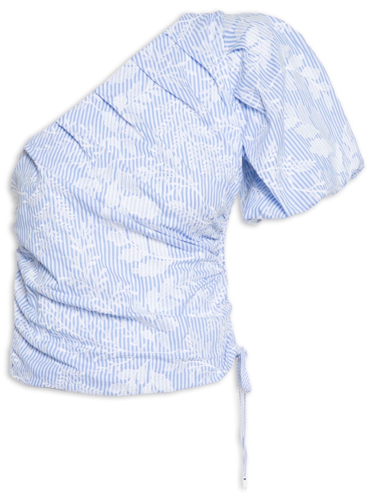 A blusa azul é confeccionada em tecido leve sem elasticidade. A peça solta ao corpo de modelo ombro único possui decote assimétrico com detalhe de drapeado, manga curta bufante com elástico embutido na barra, recorte lateral vazado com detalhe de franzido e tira embutida para ajuste, padronagem listrada em cor contrastante, bordado floral em cor contrastante, forro e fechamento lateral por zíper.